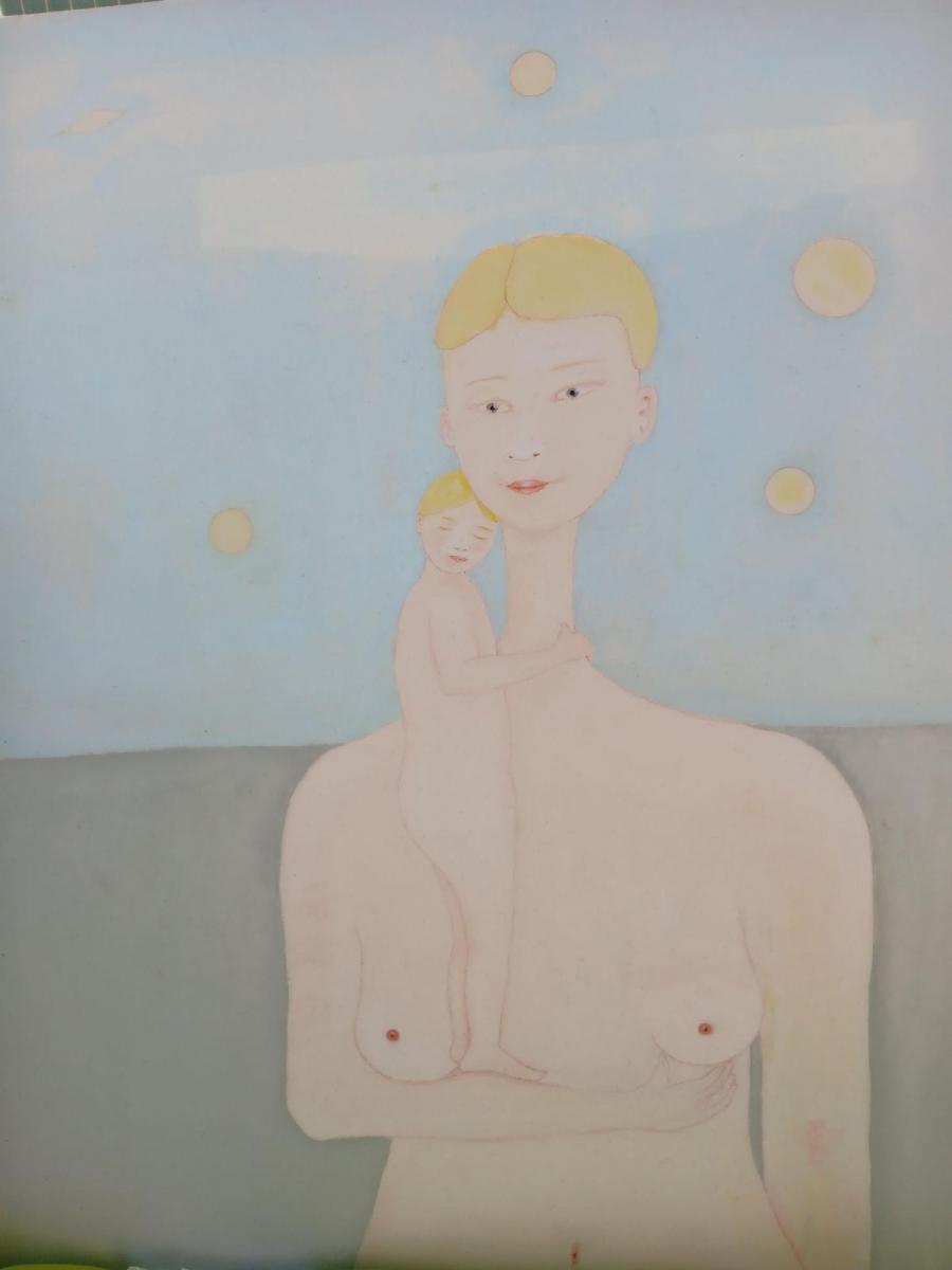 Motherhood, which is the same for all women, even the distant and perfect ones of Andromeda. They are delicate but safe, in calm serenity they transmit security and harmony to their children. The mother is communicating, letting herself be seen in her embrace of the little girl, who is holding on to her slender neck, slightly lifting her left breast with her right hand, meaning that this is her nourishment. Even mothers are not afraid. They are devoid of knowledge of the human evil that torments the earth. La maternità, che è la stessa anche per tutte le donne anche quelle lontane e perfette di Andromeda. Esse sono delicate ma sicure, nella pacata serenità trasmettono ai figli sicurezza e armonia. La mamma sta comunicando, lasciandosi vedere nell'abbraccio alla bambina, che si tiene al suo esile collo, sollevando leggermente con la mano destra il seno sinistro, a voler dire che è quello il suo nutrimento. Neanche le mamme hanno paura. Sono prive della conoscenza del male umano che tormenta la terra.