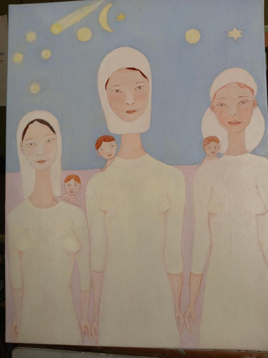Mediante un indeducibile canale di intuitività, cioe di intuizione estetica e visione, le tre donne, sorridenti ma serie, semplici ma sapienti di Andromeda, Maria, Maryam e Miryam. Esse si lasciano percepire cosi, per dare una metafora della pace necessaria alla terra: i simboli delle diverse religioni sono infatti raffigurati dalle stelle del cielo