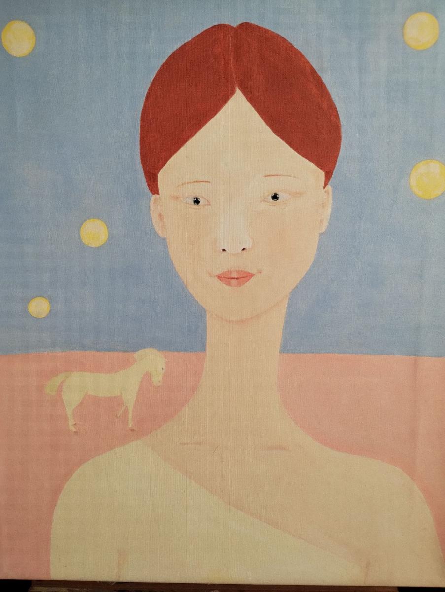 Una giovane dallo sguardo semplice sotto i cieli di un pianeta nella costellazione di Andromeda e il suo cavallo in lontananza
