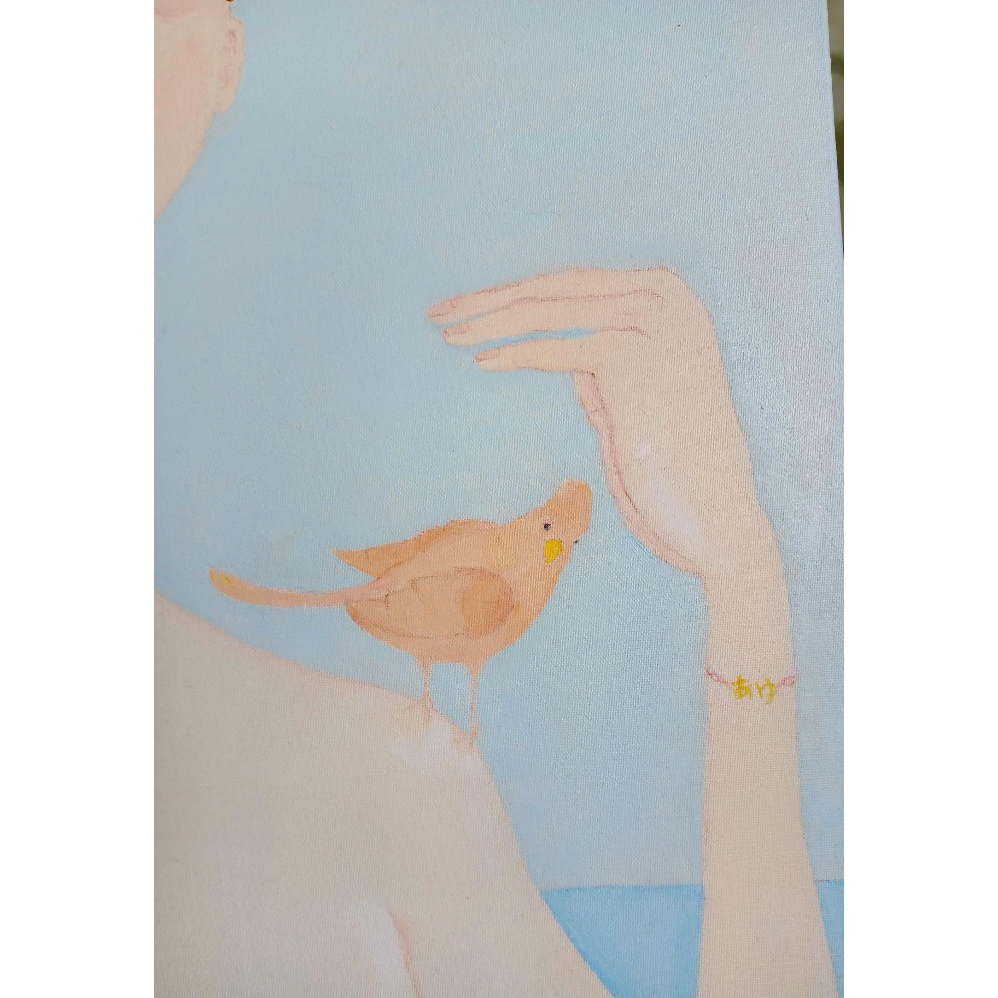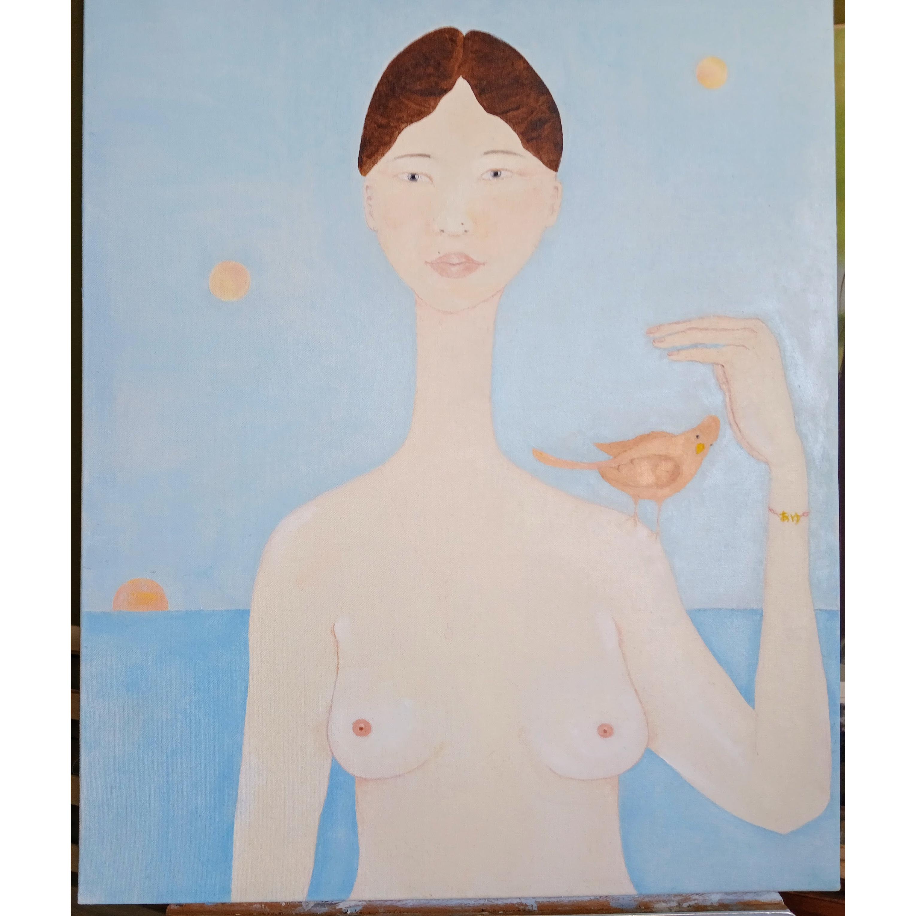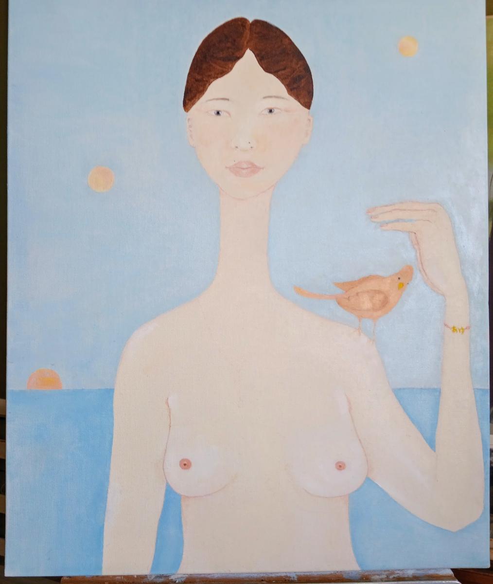 Ayu, beautiful with brown hair, looks at us, realizing that she is being seen with her hand stroking her little bird which has landed on her shoulder, happy to receive a caress. She has a pink bracelet with her name written in gold in Japanese, Ayu. She is amazed but not scared, because she knows that where she is, even if she is naked, no one no male can harm her. Ayu, bella coi capelli castani, ci guarda, accorgendosi di essere vista mentre con la mano stava accarezzando il suo uccellino che si è posato sulla sua spalla, contento di ricevere una carezza. Ha un braccialetto rosa con il suo nome scritto in oro in giapponese, Ayu. Lei è stupita ma non spaventata, poiché sa che lì dov'è anche se nuda nessuno le può fare del male.