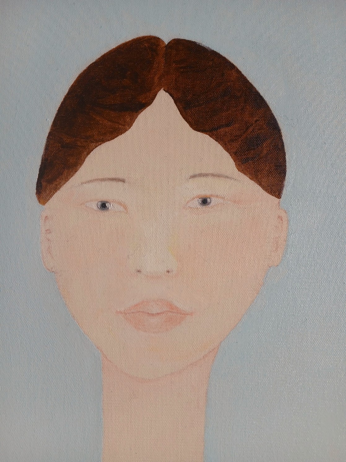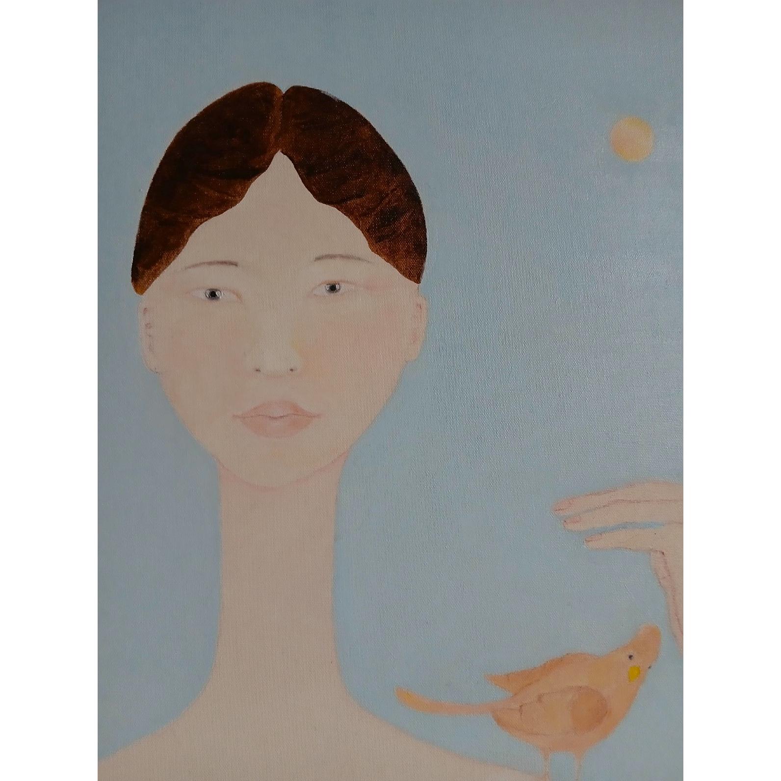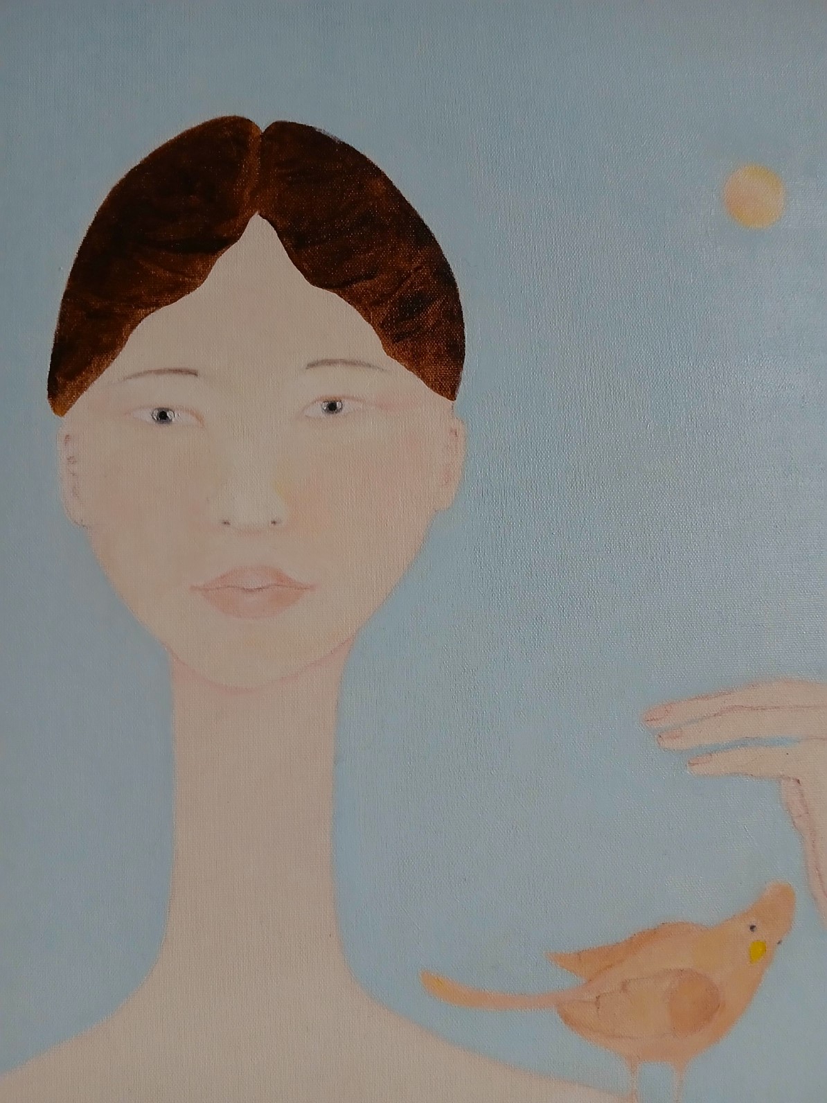 Ayu, beautiful with brown hair, looks at us, realizing that she is being seen with her hand stroking her little bird which has landed on her shoulder, happy to receive a caress. She has a pink bracelet with her name written in gold in Japanese, Ayu. She is amazed but not scared, because she knows that where she is, even if she is naked, no one no male can harm her. Ayu, bella coi capelli castani, ci guarda, accorgendosi di essere vista mentre con la mano stava accarezzando il suo uccellino che si è posato sulla sua spalla, contento di ricevere una carezza. Ha un braccialetto rosa con il suo nome scritto in oro in giapponese, Ayu. Lei è stupita ma non spaventata, poiché sa che lì dov'è anche se nuda nessuno le può fare del male.