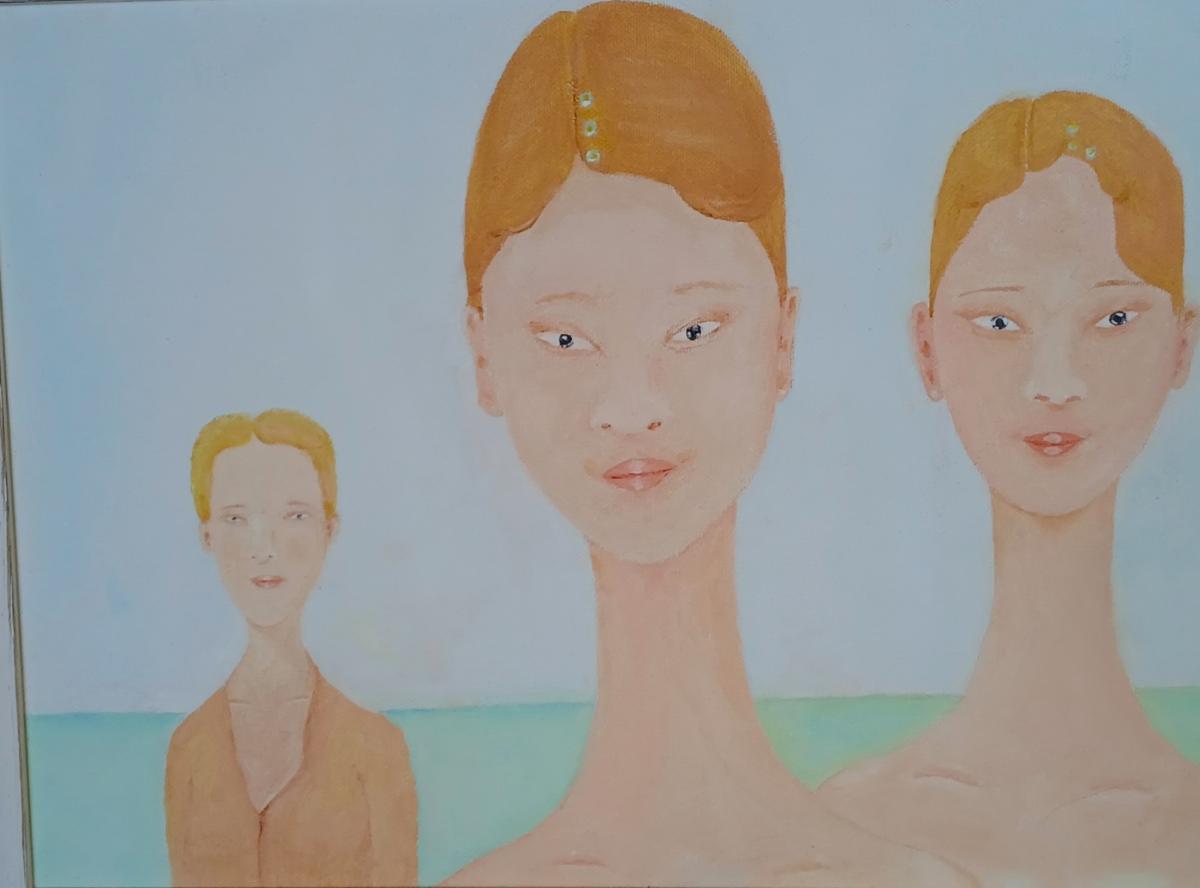 Due giovani esseri femminili piene dell'amore che esce dandosi a vedere nel loro sguardo; esse si accorgono di essere viste, colte nella loro presenza nel canale dello spaziotempo curvato che lega in un entanglement loro stesse e un essere affine sulla Terra.