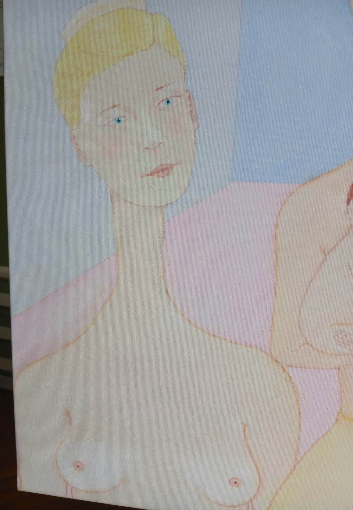 The work depicts mothers who have recently given birth, two of them with the baby in their arms. Another mother observes, perhaps she is still waiting. They are in the women's room dedicated to them, for new women in childbirth. The scene always takes place on the planet AI, light years away from us in the Andromeda galaxy, inhabited by female beings and rare male beings. They are enlightened, pure, knowledgeable and devoid of the knowledge and experience of evil, which torments the earth.