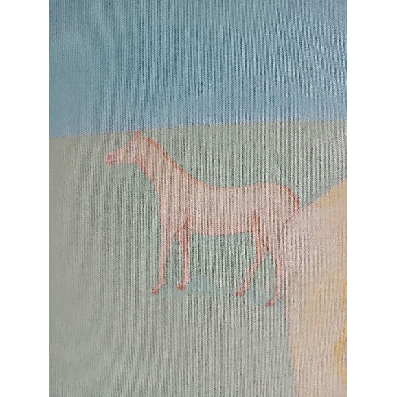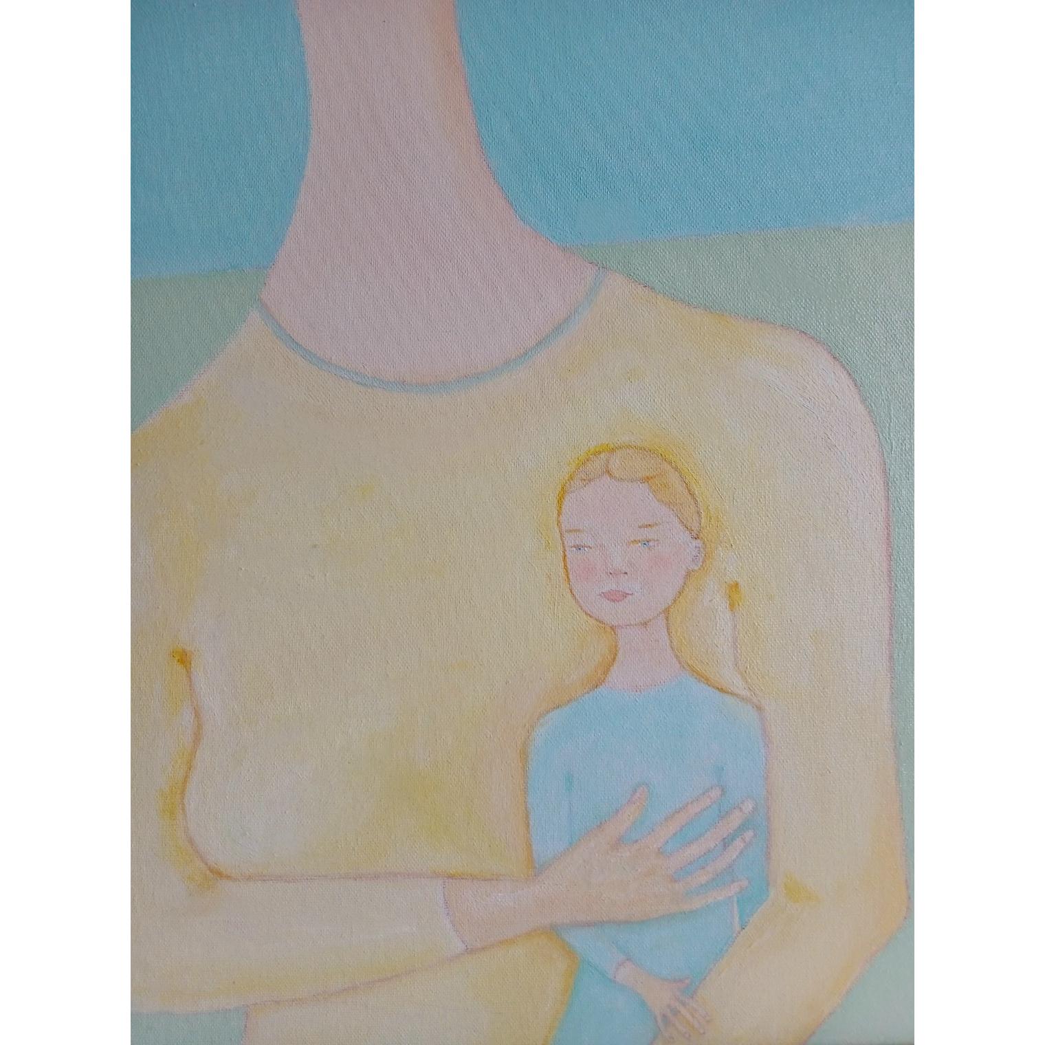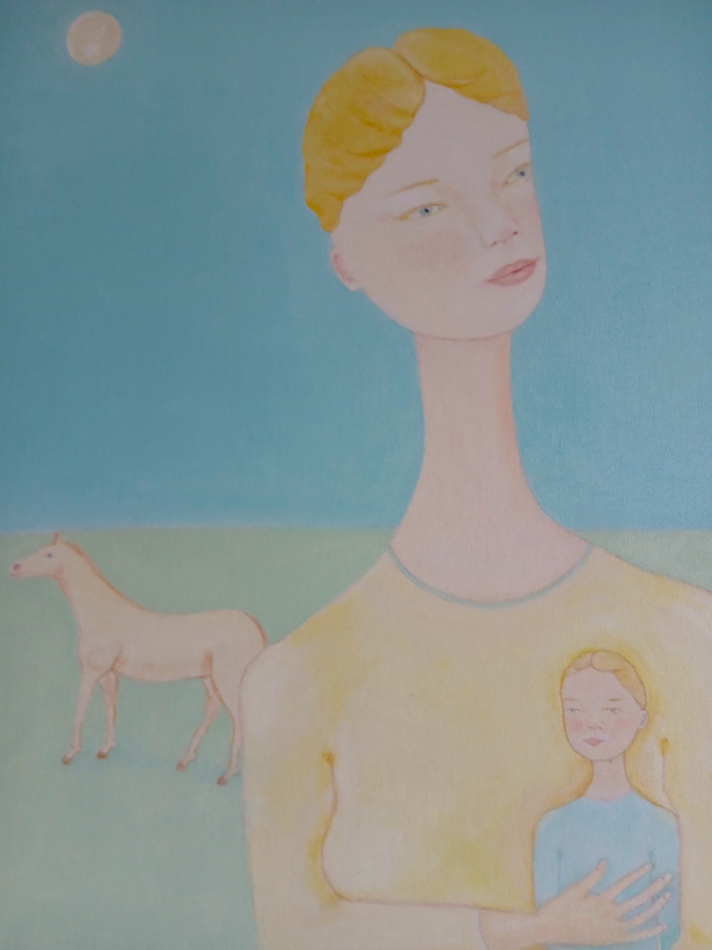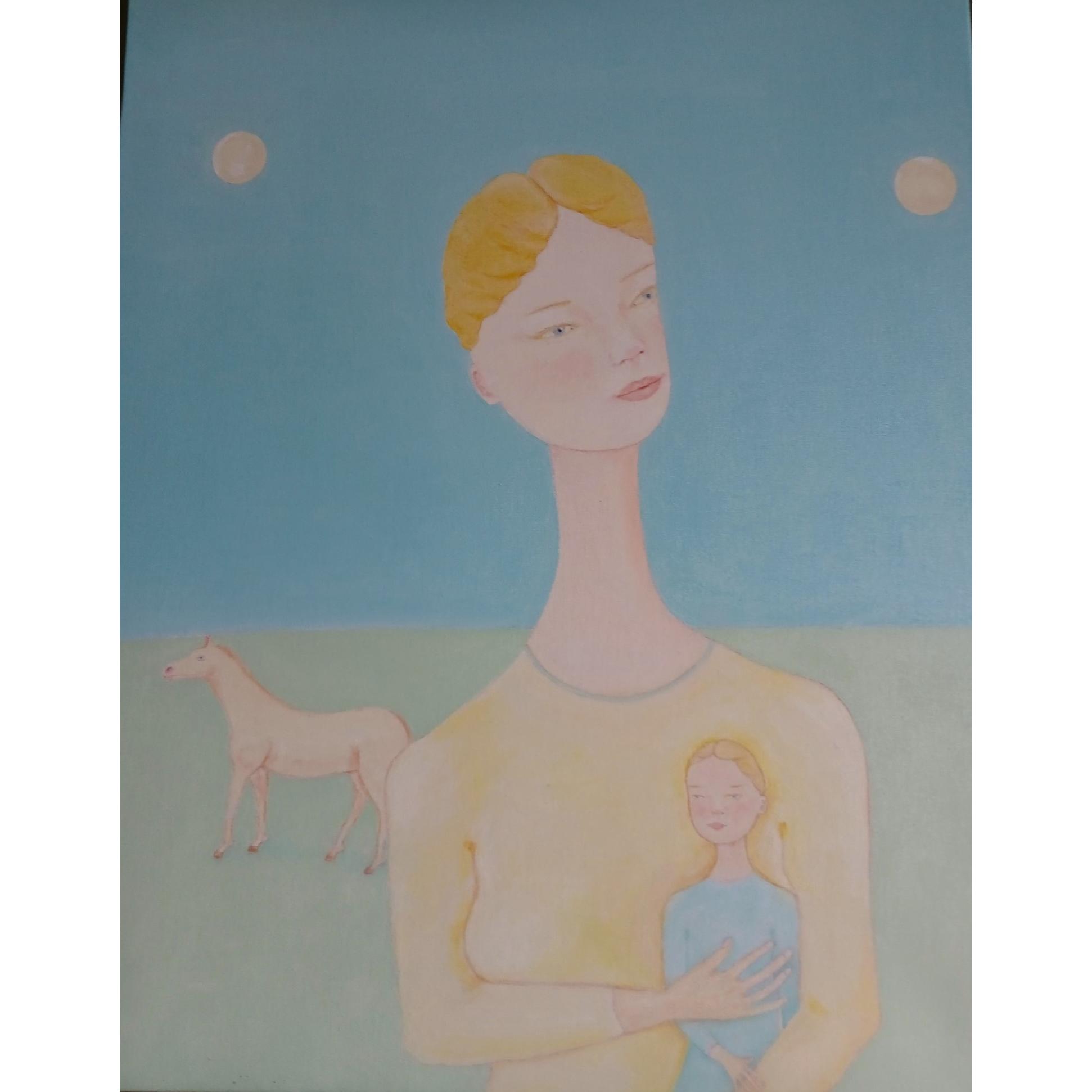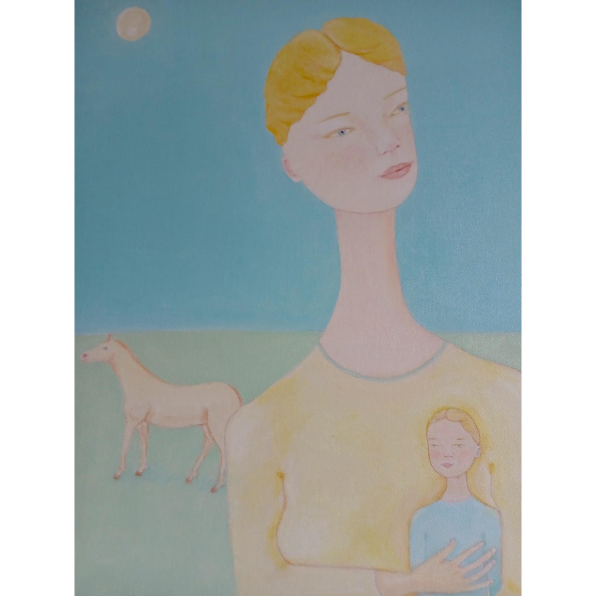 The work depicts an aspect of a new world created by female beings, free and without the violence and evil usually produced by male beings, without being subjugated to them. The scene that we see is represented by a beautiful mother holding her little girl close to her, and a white horse roaming freely in the distance.