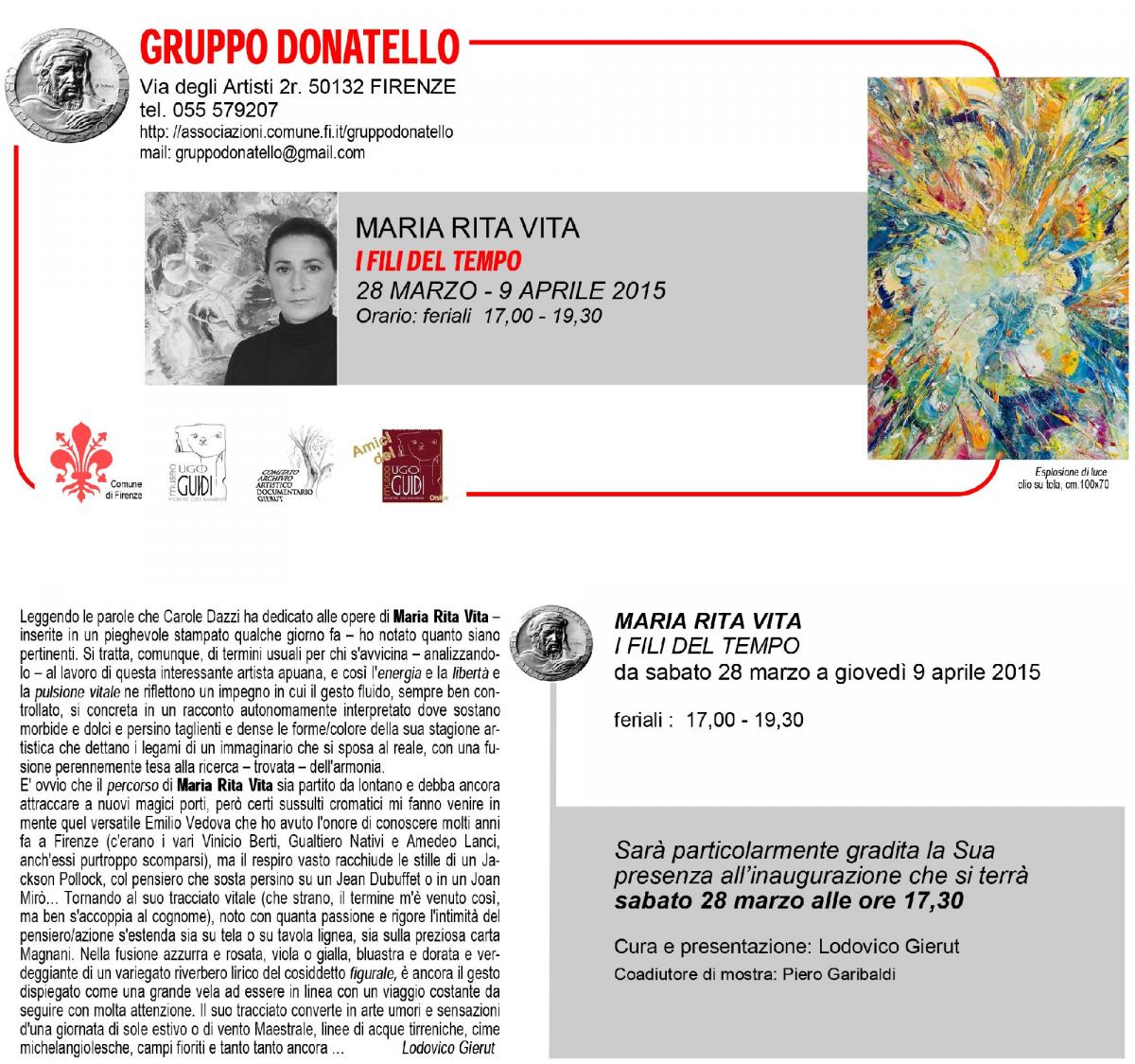 Ad esprimere la continua relazione tra stato e contesto si pone, il progetto artistico curato da Lodovico Gierut, “ Maria Rita Vita, I Fili del Tempo” di Maria Rita Vita che colorerà la Galleria dello storico “Gruppo Donatello Firenze”, di Via degli Artisti 2r, da Sabato 28 marzo a Giovedì 9 Aprile, esclusa Domenica 5 Aprile, con apertura dalle 17 alle 19:30.
