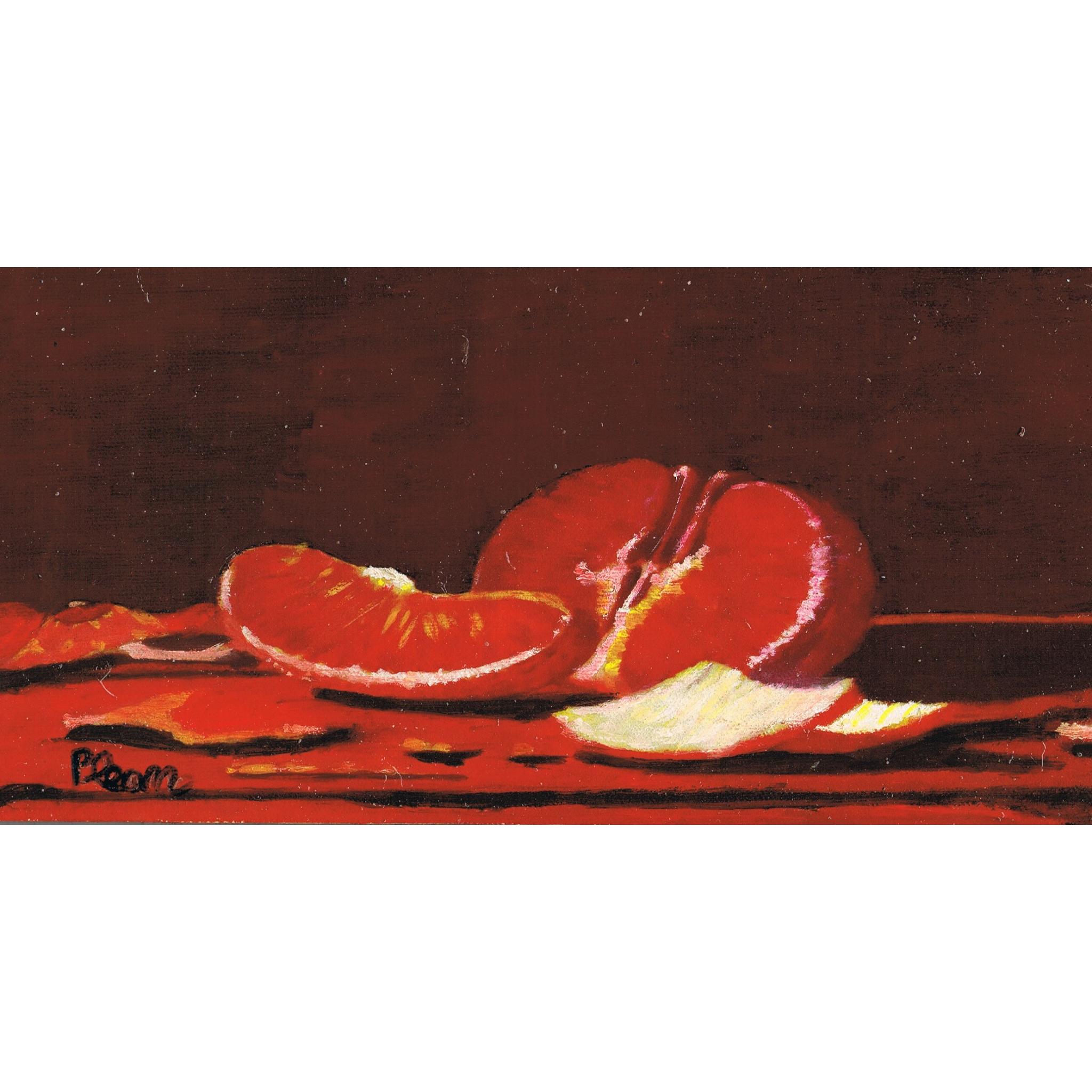 Olio su tela, il dipinto raffigura un'arancia sbucciata con uno spicchio e buccie su di un tavolo ; il supporto utilizzato è tela su tavola di legno delle dimensioni di 30 x 15 cm.
