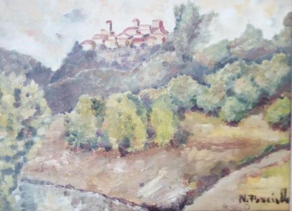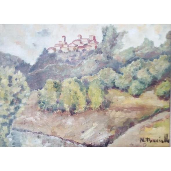E dal fiume si vedeva, sovrastare, il paesello (olio su tavoletta telata dim. 20X25 cm)
