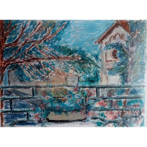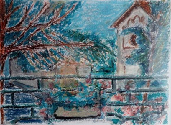Saturnia Il balcone sul retro dà visione della chiesetta (pastelli ad olio su tavoletta telata dim. 30x40 cm)