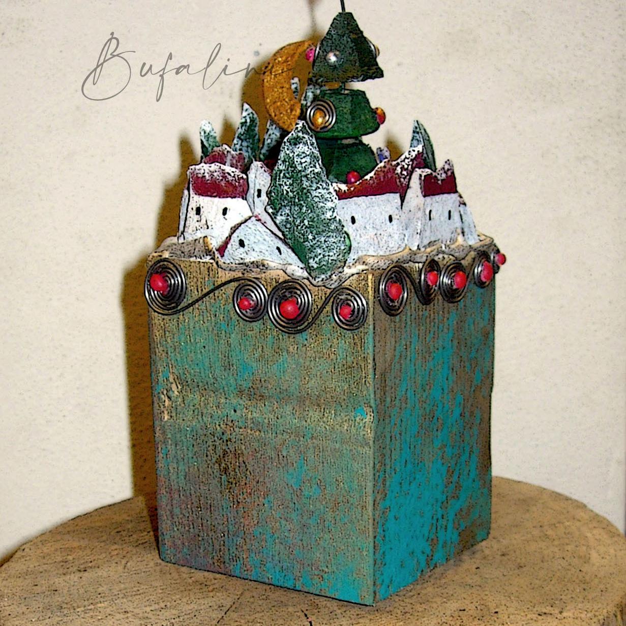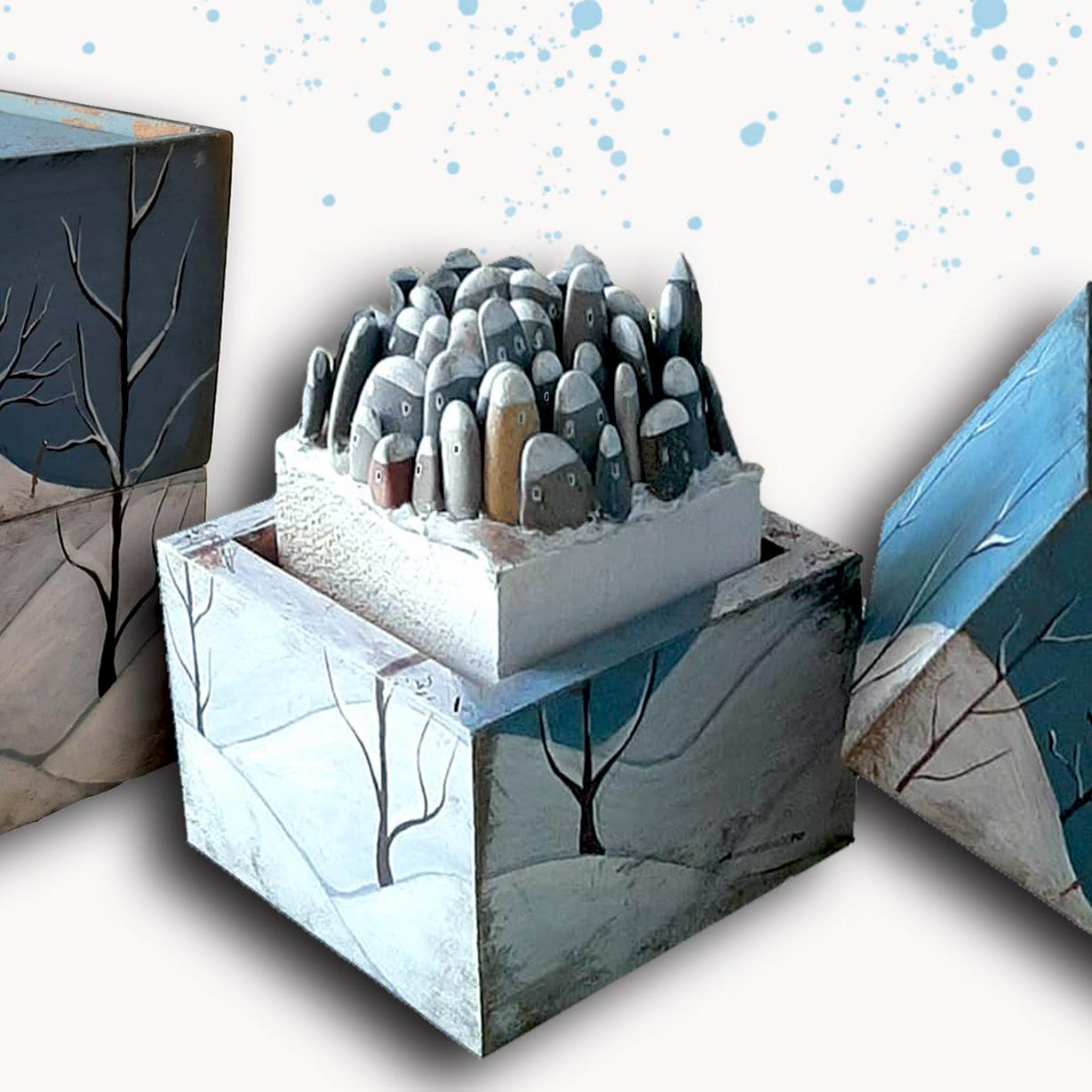 paesaggio innevato su cubo di legno