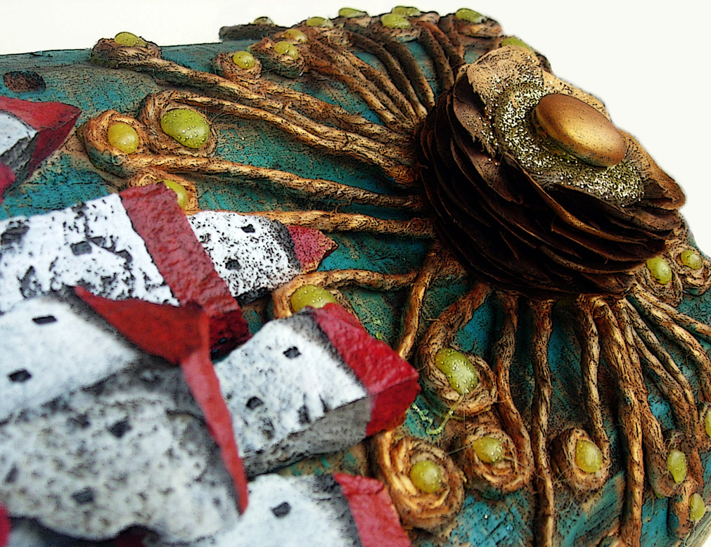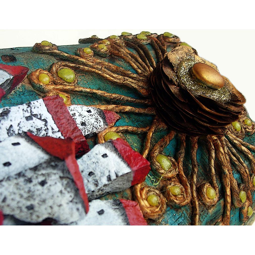 Quadro realizzato mediante assemblaggio di sassi dipinti e altri materiali naturali di recupero.