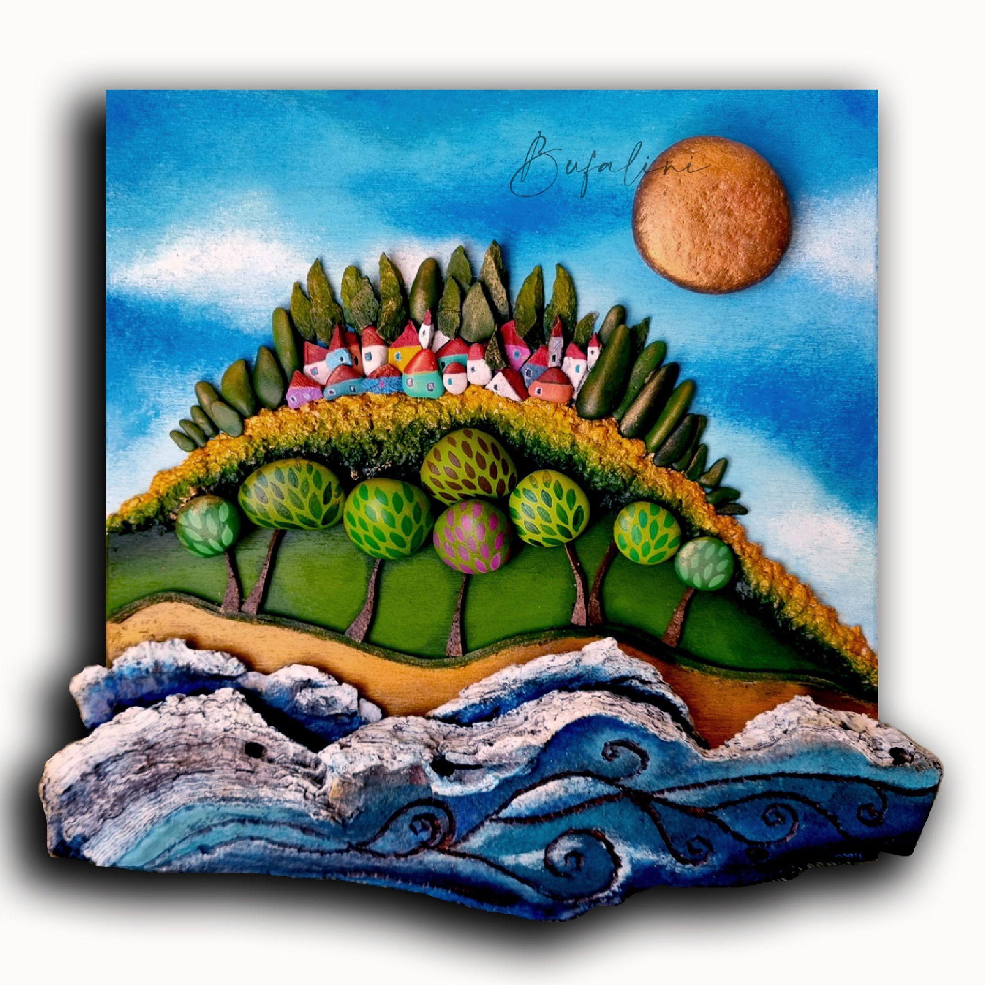 Paesaggio toscano realizzato su base di legno dipinta, mediante assemblaggio di sassi dipinti e altri materiali naturali