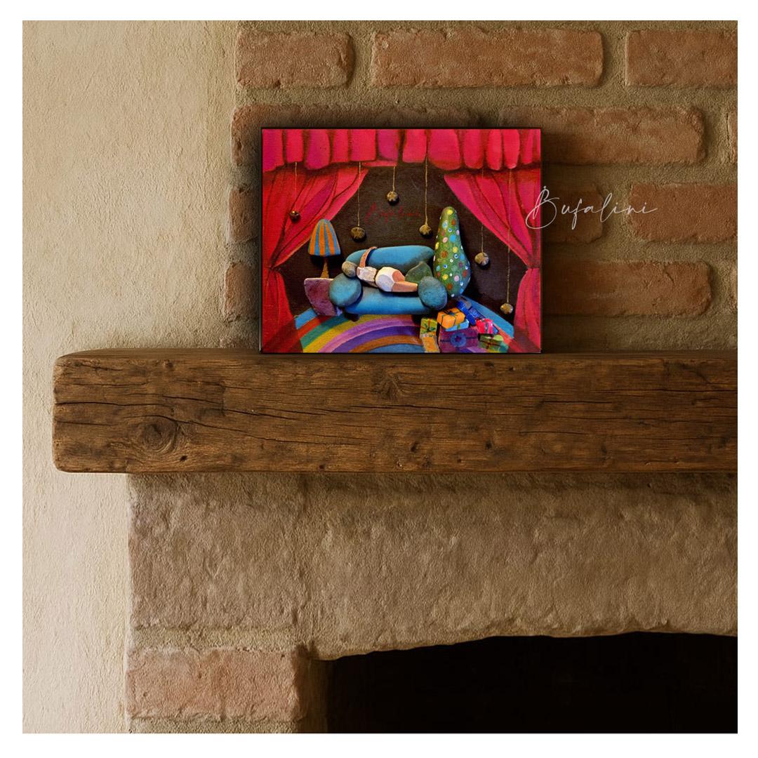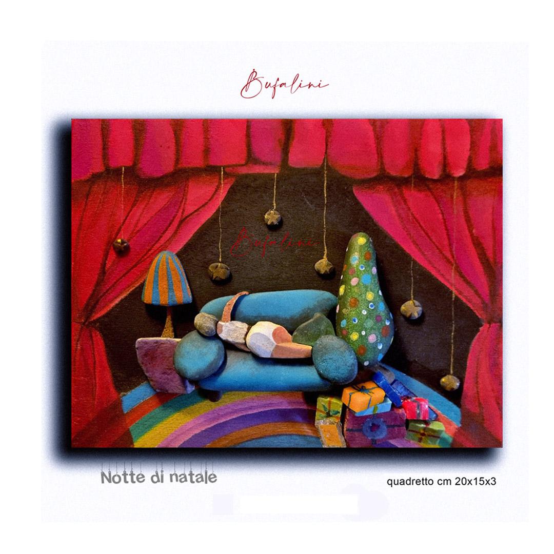 Quadretto sia da appendere che da appoggiare, rappresenta la notte di natale di una ragazza sola e molto stanca...realizzata mediante assemblaggio di sassi dipinti du base di legno dipinta