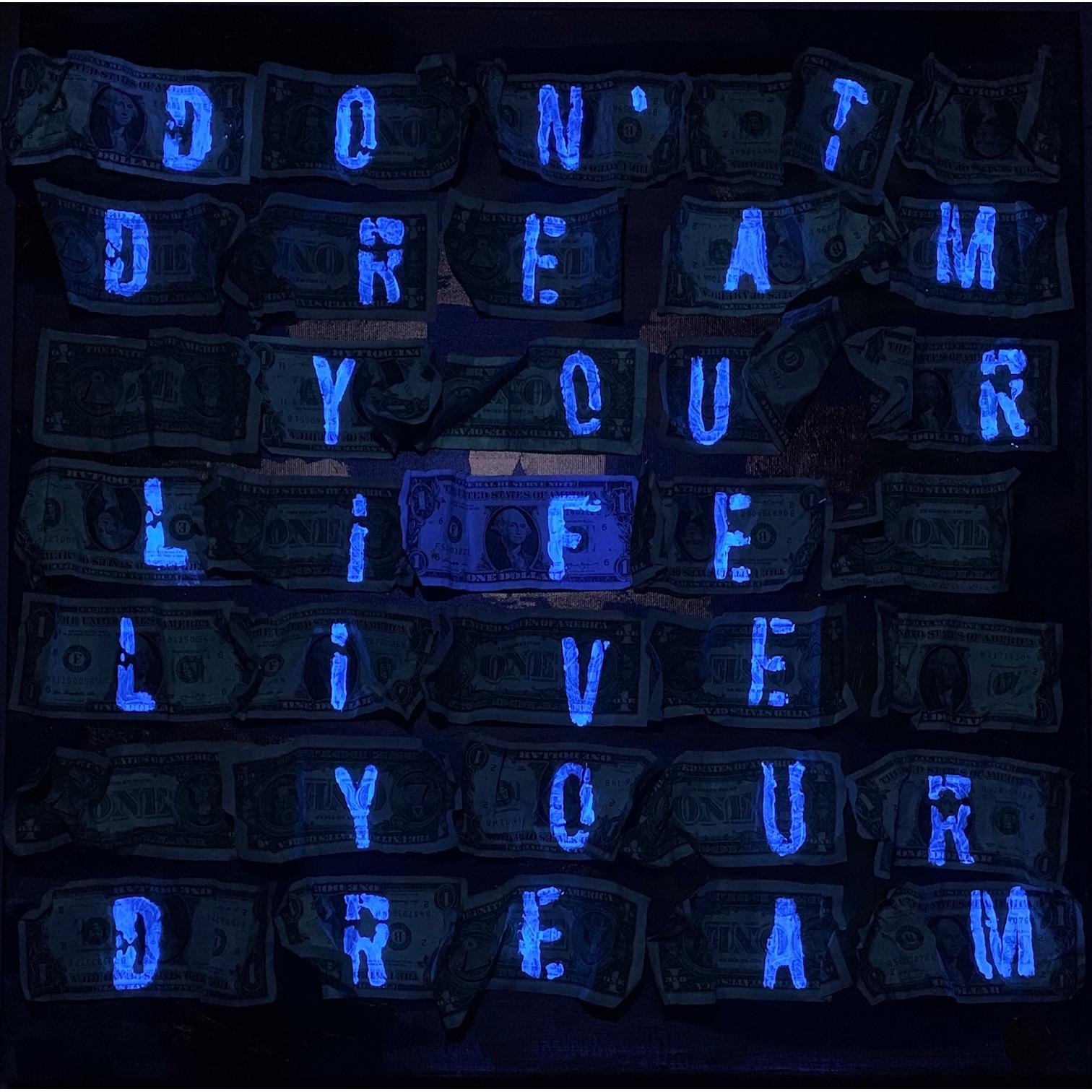 COLLEZIONE THINK FREE Tecnica materica, colore acrilico turchese e oro su tela con applicazione di foglie d'oro e banconote americane 1$. I dollari americani sono diventati - nel mondo occidentale - i simboli dei sogni, dell'unione, della libertà personale e individuale. L'opera nasconde un segreto per poterlo vedere è necessario crederci o semplicemente illuminare il quadro con la luce wood e magicamente apparirà una frase storica ! Quest' opera nasconde un altro segreto, una banconota è stata tracciata sul sito www.wheresgeorge.com per seguire il viaggio dell'opera e i suoi spostamenti attraverso gallerie e musei di tutto il mondo.