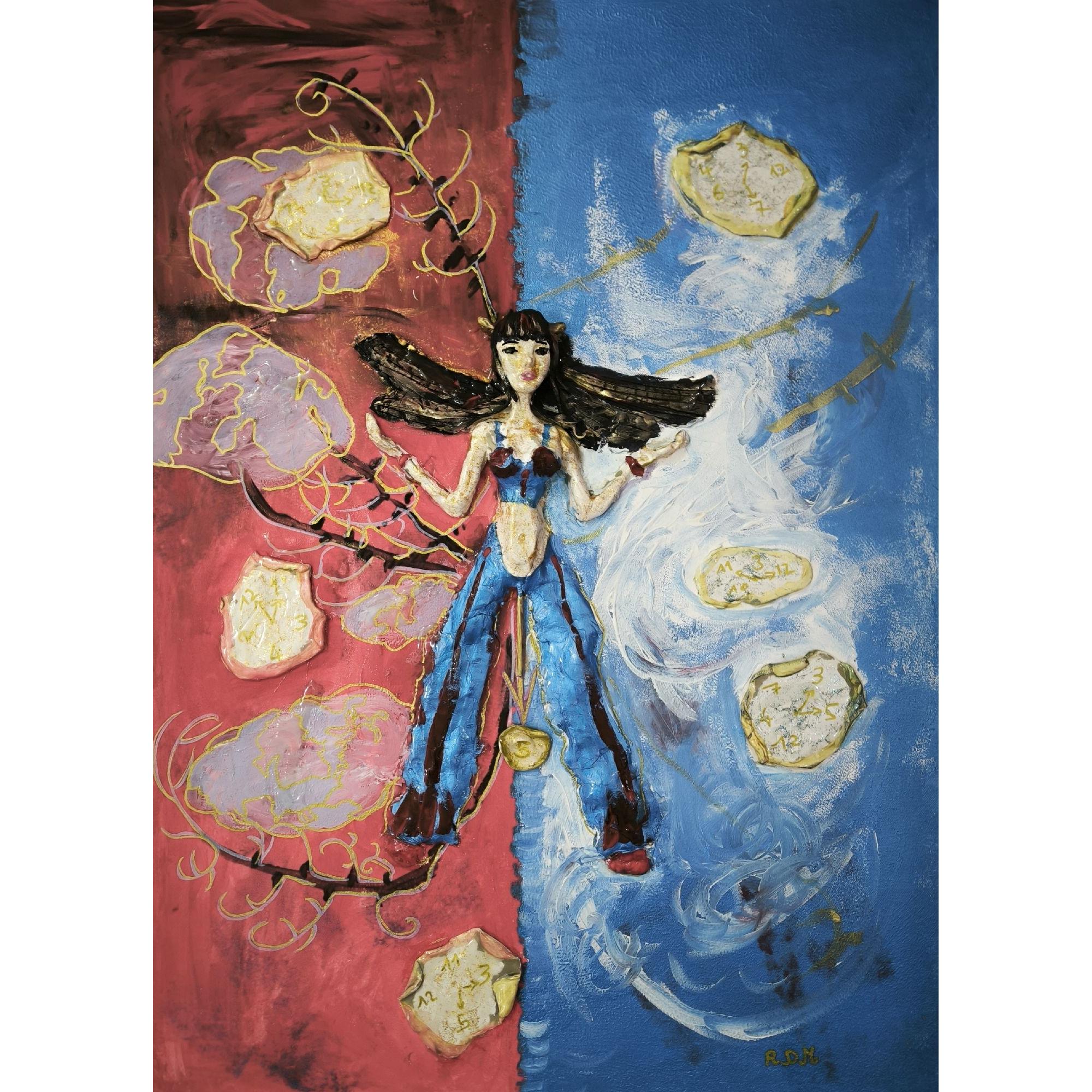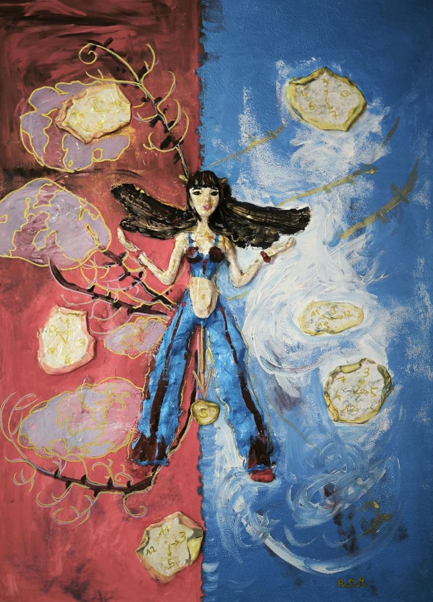 L'opera rappresenta una figura centrale che si sposta tra universi paralleli attraverso il suo spirito, in assenza di tempo.