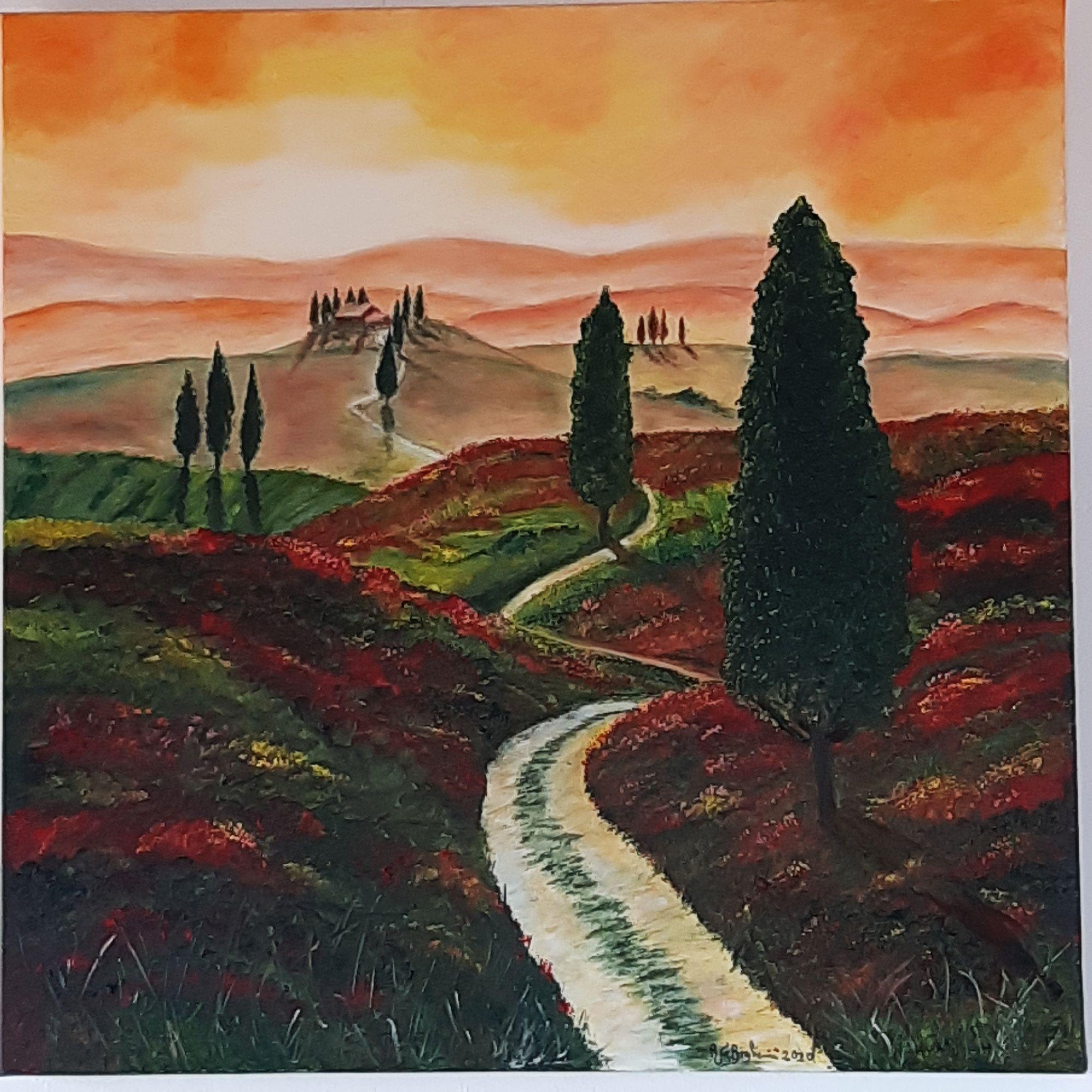In un caldo pomeriggio d'Agosto si percorre una strada che s'inerpica tra le colline toscane in direzione della una luce ! Pittura realizzata a mano con tecnica ad olio su supporto telato . Opera unica firmata e munita di certificato di autenticità. Questa Opera non necessita di cornice poichè lo spessore della stessa è di cm.3 e montata su apposito supporto. - Opera pubblicata sul 5° Volume del Premio Sgarbi ! Trattamento con vernice finale di protezione agenti atmosferici . Per info inviare e-mail a : begliomini19@gmail.com