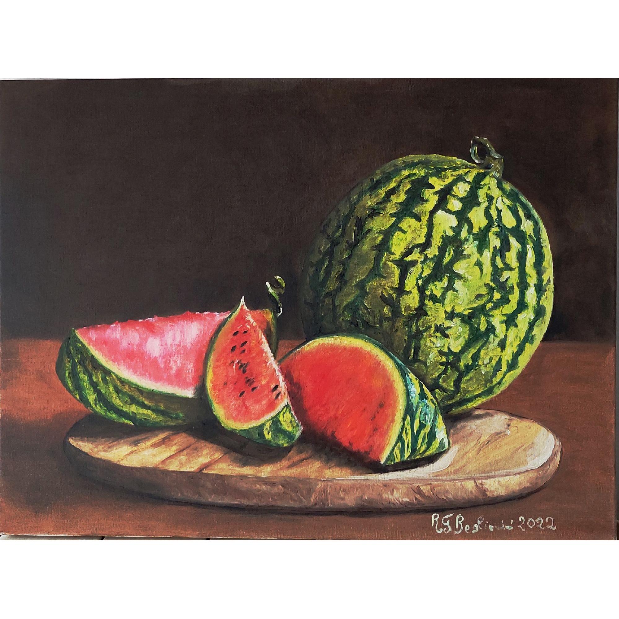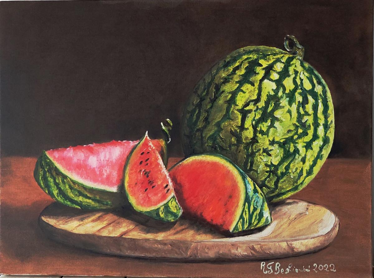 Si certifica che l'artista Roberta Grazia Begliomini giovedì 9 giugno 2022 ha archiviato la foto dell'opera GA194233 dal titolo "COCOMERO E FETTE SU TAGLIERE "