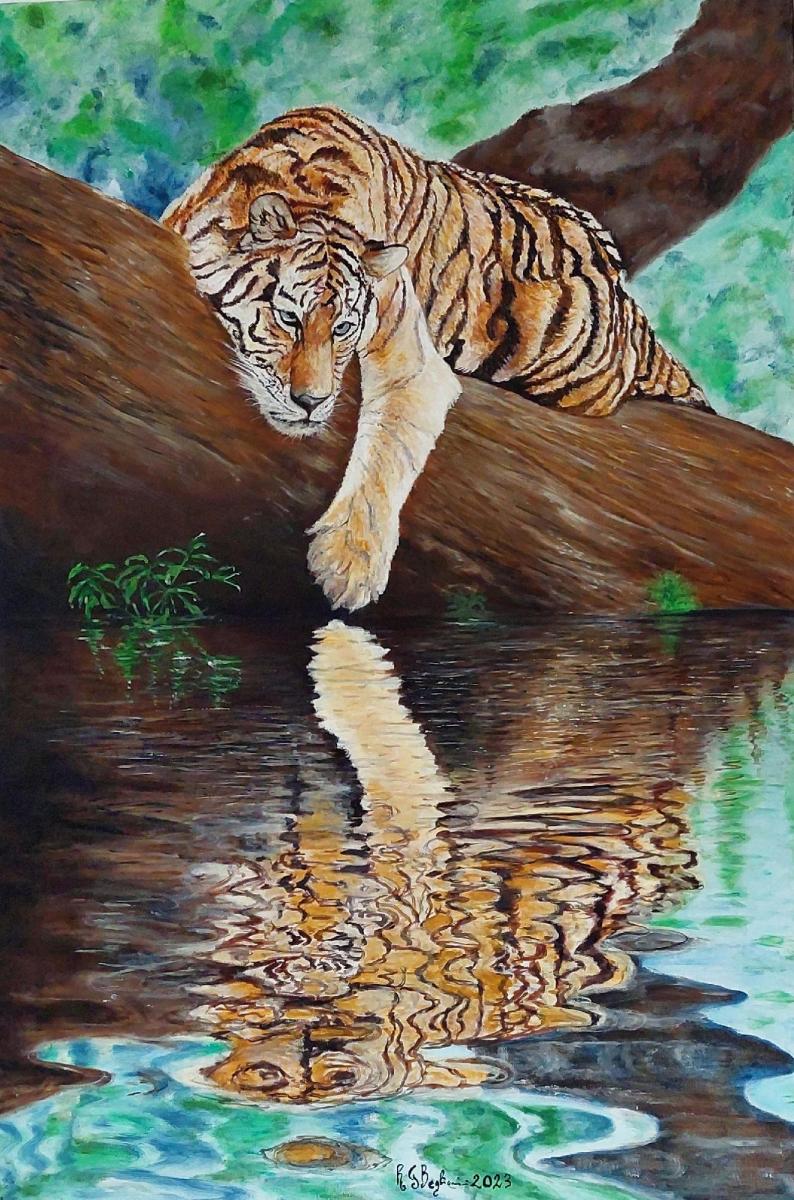 Pittura realizzata a mano con tecnica ad olio su tela. Opera unica firmata e munita di certificato di autenticità. Questa Opera non necessita di cornice avendo uno spessore di cm. 3 e puo essere appesa direttamente essendo munita di apposito appiglio, ed e' dipinta su ogni lato. Tutte le mie Opere vengono vendute con trattamento di apposita vernice finale di protezione dagli agenti atmosferici . Per info inviare e-mail a : begliomini19@gmail.com OPERA PUBBLICATA SUL VOLUME "80 PROPOSTE PER IL COLLEZIONISTA" a cura di Agelo Crespi - Fondazione Effetto Arte - Art NoW - La recensione all'Opera “Riflessione Felina” del dott. Crespi : " una pittura simbolista quella di Begliomini indirzzata al raggiungimento della purezza delle forme attraverso gesti pittorici immediati e autentici che la rendono accostabile all'Arte di Ligabue, rieletto, tuttavia in una dimensionepiu metafisica. In altri termini, l'artista predilige una sublimazione surreale della natura,ispirandosi alle declinazioni della realtà, poi astratte in una propria dimensione, che è quella della propria visione intima. La figura della Tigre in primo piano, adagiata sul tronco d'albero e immersa in uno stato di riflessione prima ancora che di rifrazione sullo specchio d'acqua, si fa così emblema della forza istintuale domata dal pensiero cosciente di se". Coefficiente di Galleria 3 per tutta la produzione artistica