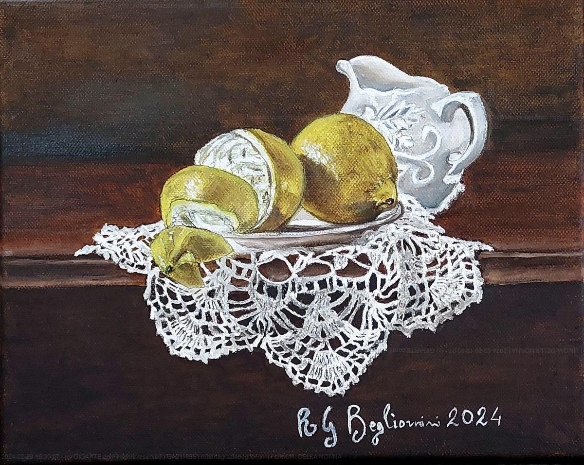 Si certifica che l'artista Roberta Grazia Begliomini giovedì 29 febbraio 2024 ha archiviato la foto dell'opera GA211895 dal titolo "I LIMONI DELLA NONNA"