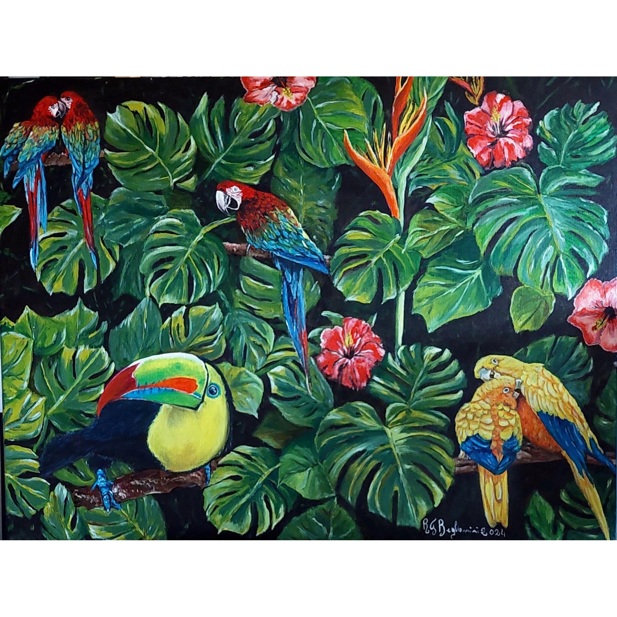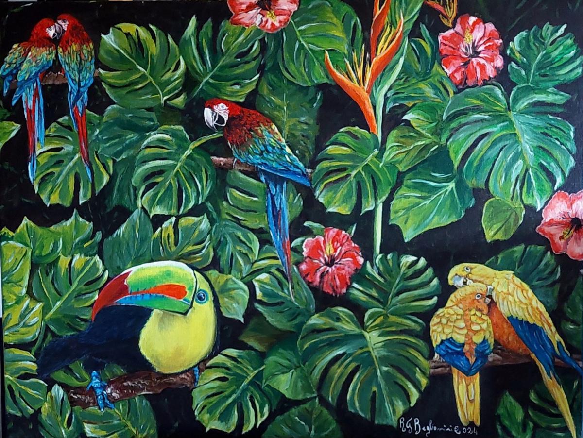 Si certifica che l'artista Roberta Grazia Begliomini domenica 1 giugno 2025 ha archiviato la foto dell'opera GA227697 dal titolo "PARROTS IN THE GARDEN"