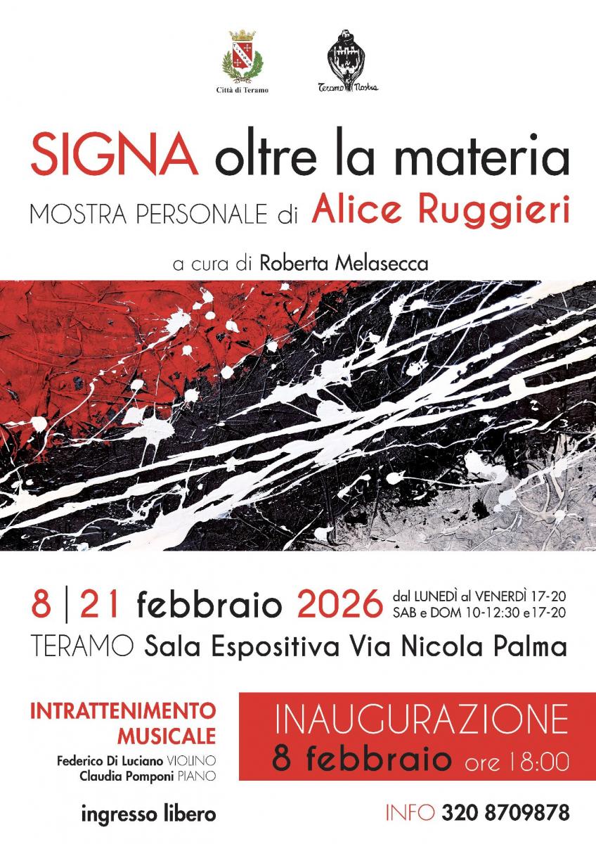 Domenica 8 febbraio 2026 alle ore 18,00, l’Associazione Teramo Nostra presenta la mostra personale SIGNA: oltre la materia di Alice Ruggieri a cura di Roberta Melasecca. In esposizione una serie di opere, appartenenti all’ultimo ciclo di produzione dell’artista, incentrata sul valore e significato del segno pittorico.