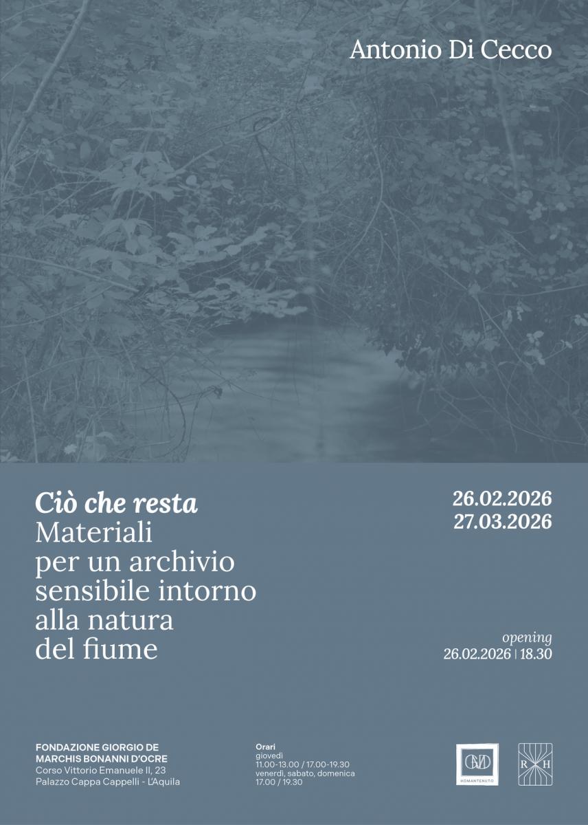 Giovedì 26 febbraio 2026 alle ore 18.30, la Fondazione Giorgio de Marchis Bonanni d'Ocre è lieta di ospitare la mostra Ciò che resta - Materiali per un archivio sensibile intorno alla natura del fiume di Antonio Di Cecco, a cura della Fondazione e di RVM Hub.