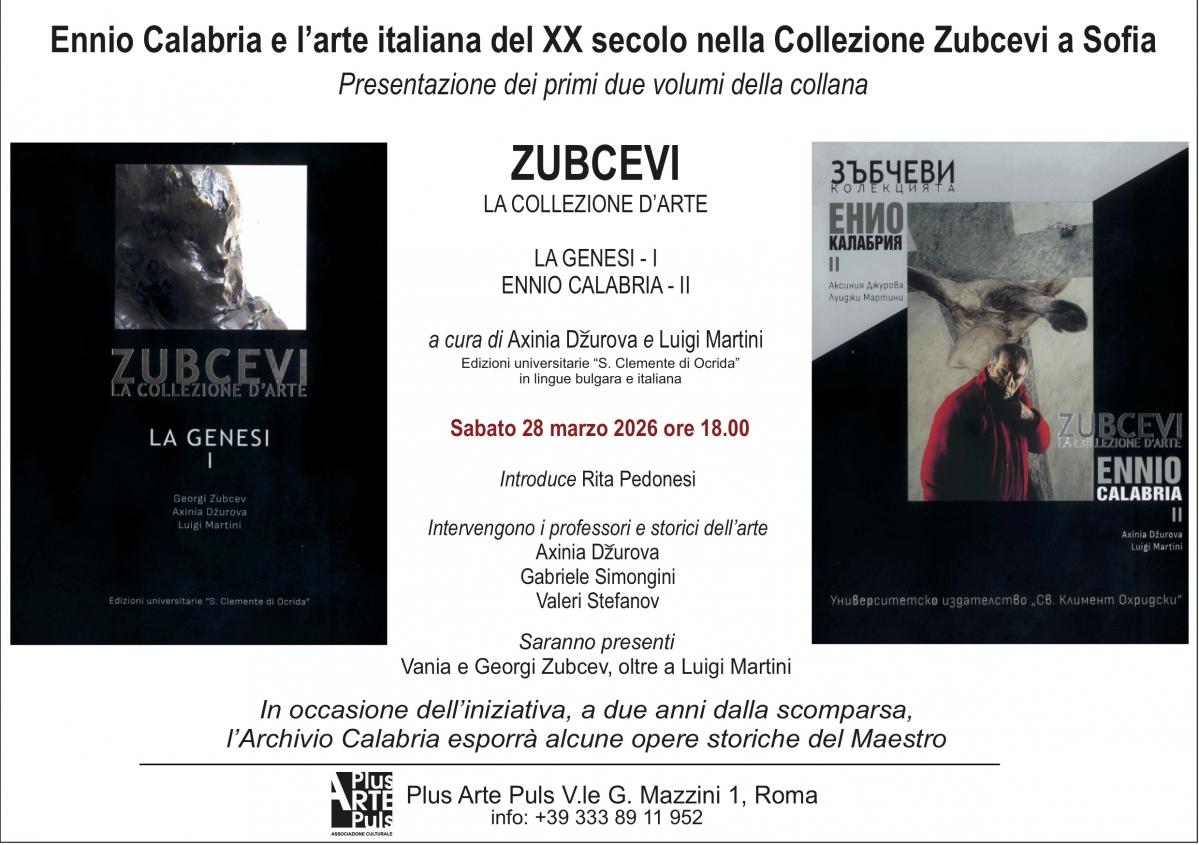 Sabato 28 marzo alle ore 18:00, negli spazi di Plus Arte Puls, a Roma, si terrà la presentazione dei primi due volumi della collana Zubcevi. La Collezione d'arte: I - La genesi; II - Ennio Calabria, a cura di Axinia Dzurova e Luigi Martini, delle Edizioni universitarie “S. Clemente di Ocrida”, pubblicati nelle lingue bulgara e italiana.
