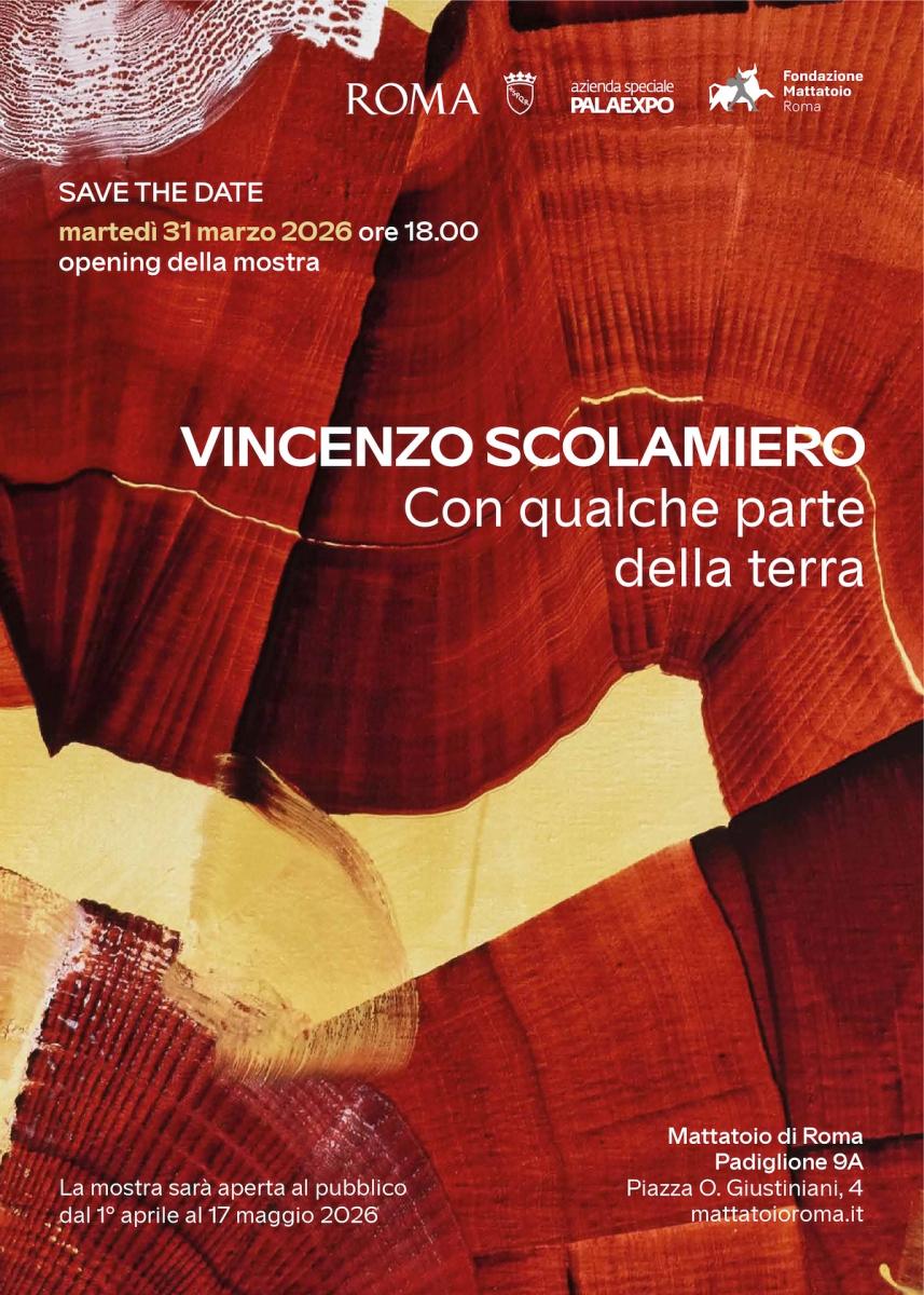 Dal 1° aprile al 17 maggio 2026 il Mattatoio di Roma presenta la mostra Vincenzo Scolamiero. Con qualche parte della terra, promossa da Assessorato alla Cultura di Roma Capitale, Azienda Speciale Palaexpo e Fondazione Mattatoio di Roma – Città delle Arti, con il patrocinio dell’Accademia di Belle Arti di Roma e dall’AICA, Associazione Internazionale dei Critici d’Arte. Realizzata da Azienda Speciale Palaexpo in collaborazione con Twiceout.