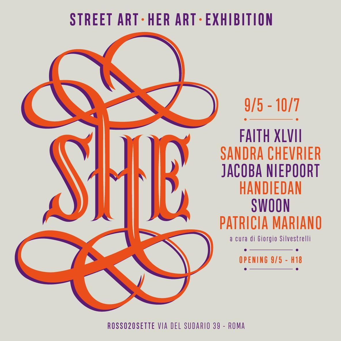 Scrive il curatore, Giorgio Silvestrelli: «La parola she è un pronome inglese che può essere tradotto con “lei” e, per questa mostra, è diventato anche l’acronimo di Street (Art) - Her (Art) - Exhibition. “S” come street art, ovvero il movimento a cui appartengono le sei straordinarie artiste di indiscussa fama internazionale qui in mostra. “H” si riferisce alla parola inglese her, intesa sia come aggettivo possessivo femminile che pronome. Her (Art), dunque, per sottolineare che l’arte in mostra è opera di un’artista donna. Infatti, il termine artist in inglese, così come quasi tutte le parole di questa lingua, è neutro, privo di genere. A chiudere, la “E” di exhibition. La punta dell’iceberg. Giorni, settimane e mesi di lavoro che diventano opere, prendono corpo e spazio sui muri della galleria. Sentimenti, idee, passioni, stili, tecniche e colori si concretizzano per essere esibiti e ammirati.