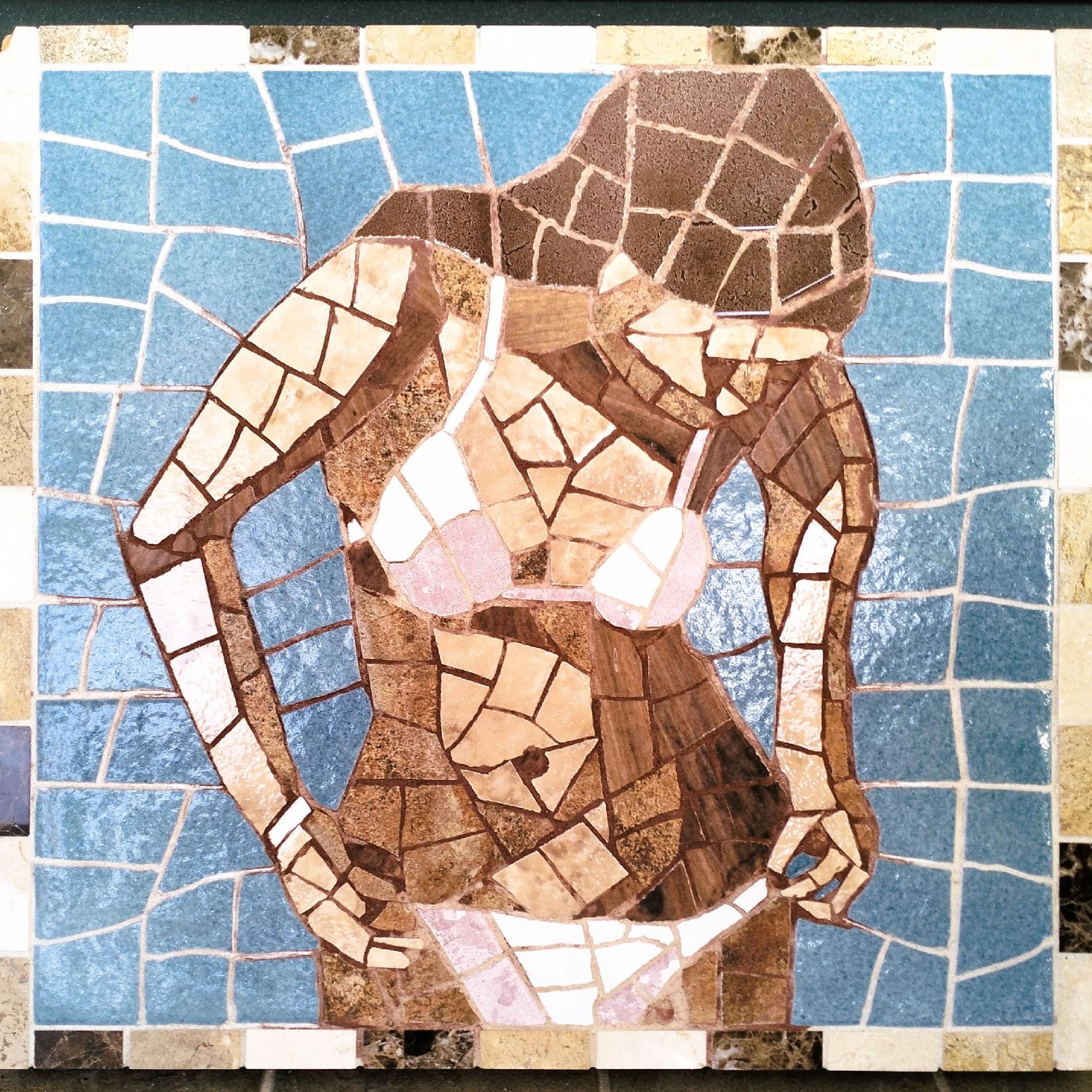 Quadro in mosaico di ceramica di una donna che si mette il bikini