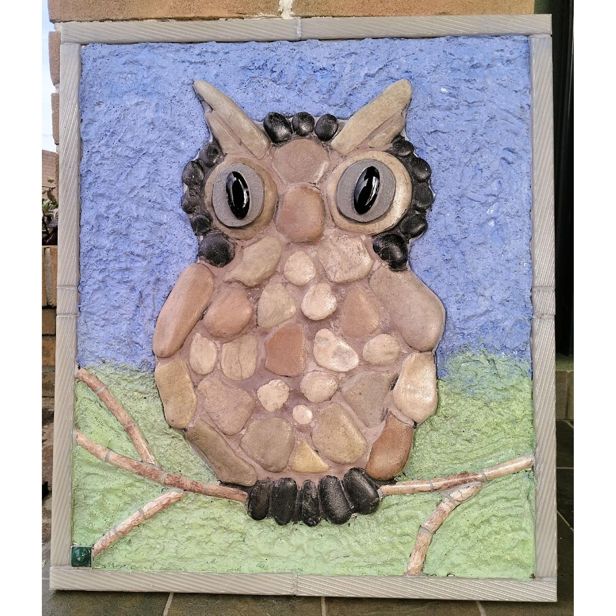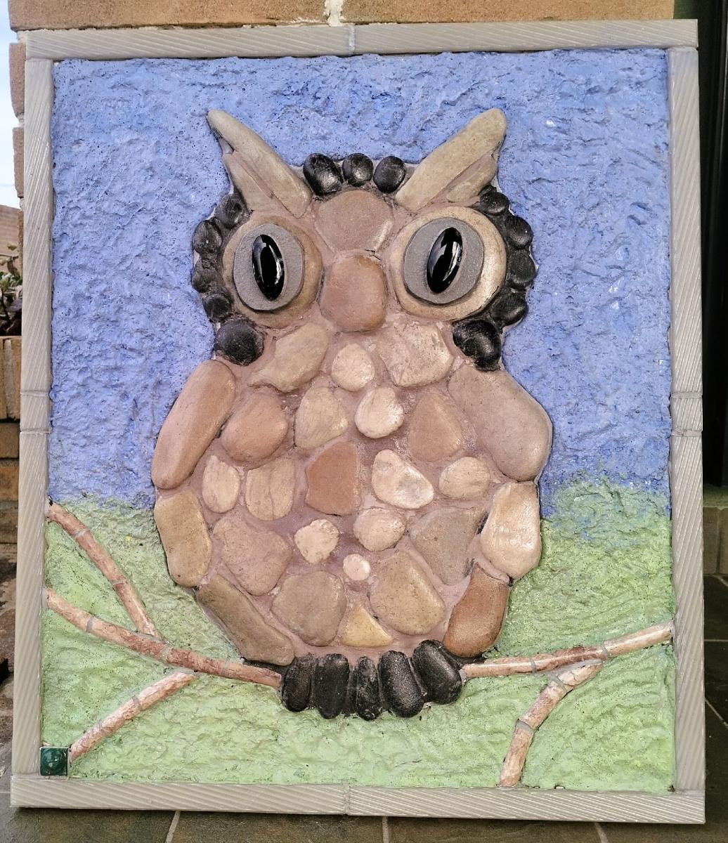 Quadro in mosaico di pietre del mare con base legno di un simpatico gufetto formato 50 x 60 cm