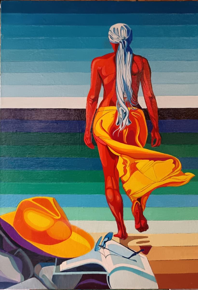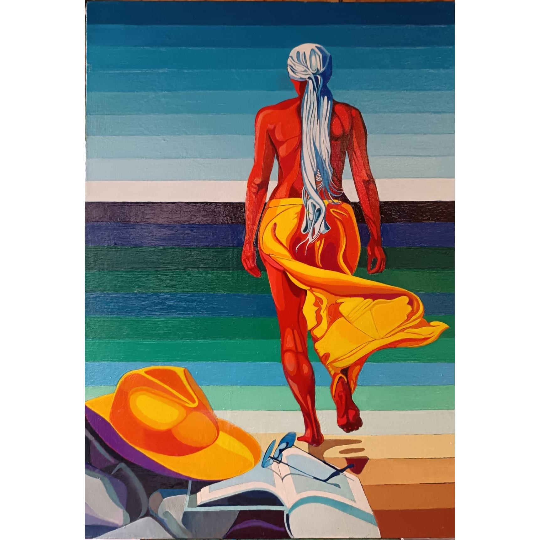 Figura femminile simbolica. Dopo la lettura, sospesa, dal desiderio di incamminarsi verso l'orizzonte che segna il confine tra mare e cielo.