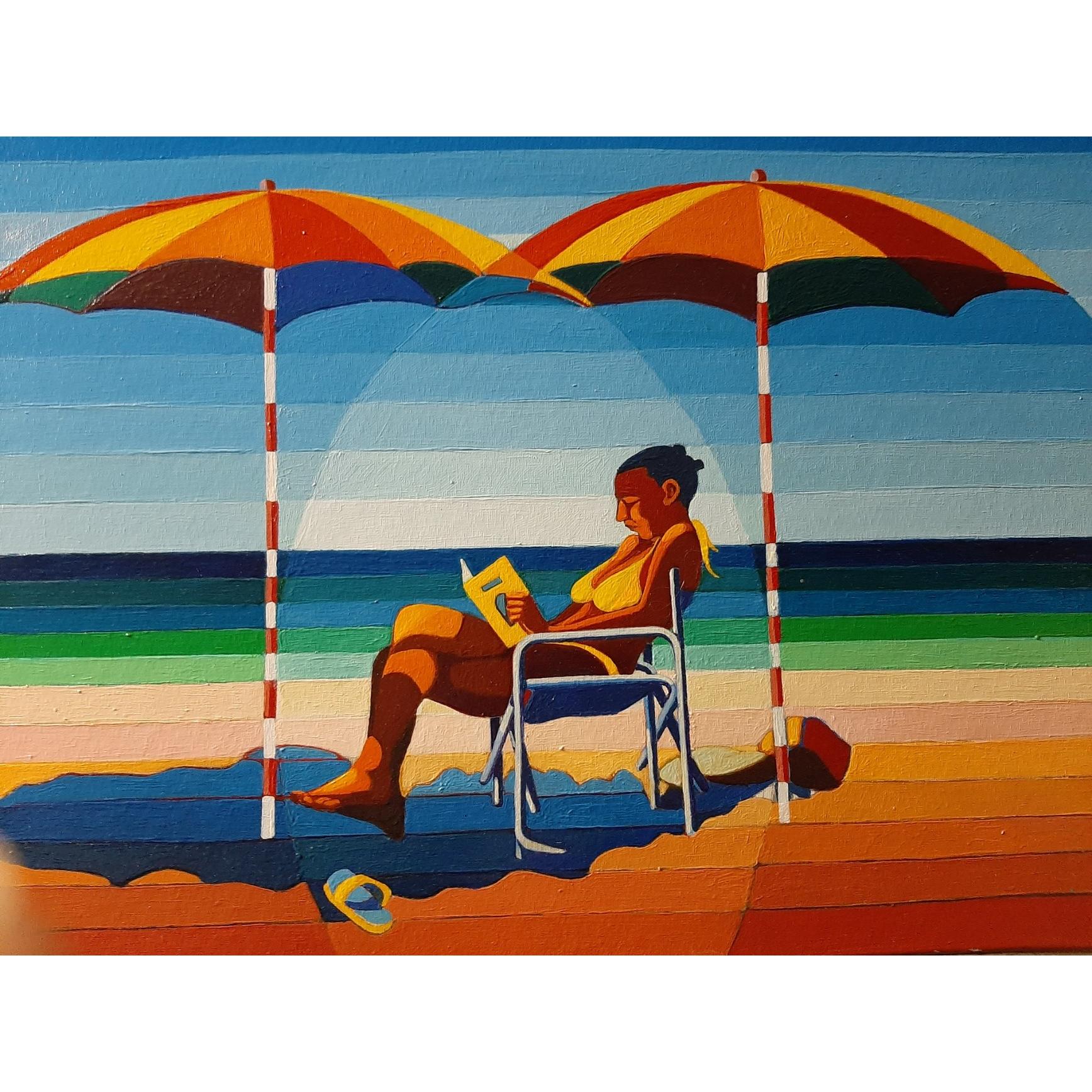 Giovane donna legge sulla spiaggia di San Pietro Valledoria in un'atmosfera tra il metafisico e il surreale data dal cielo mare spiaggia stilizzati (a strisce orizzontali) tipico delle mie rappresentazioni e dal doppio ombrellone stilizzato