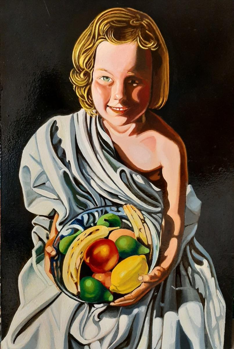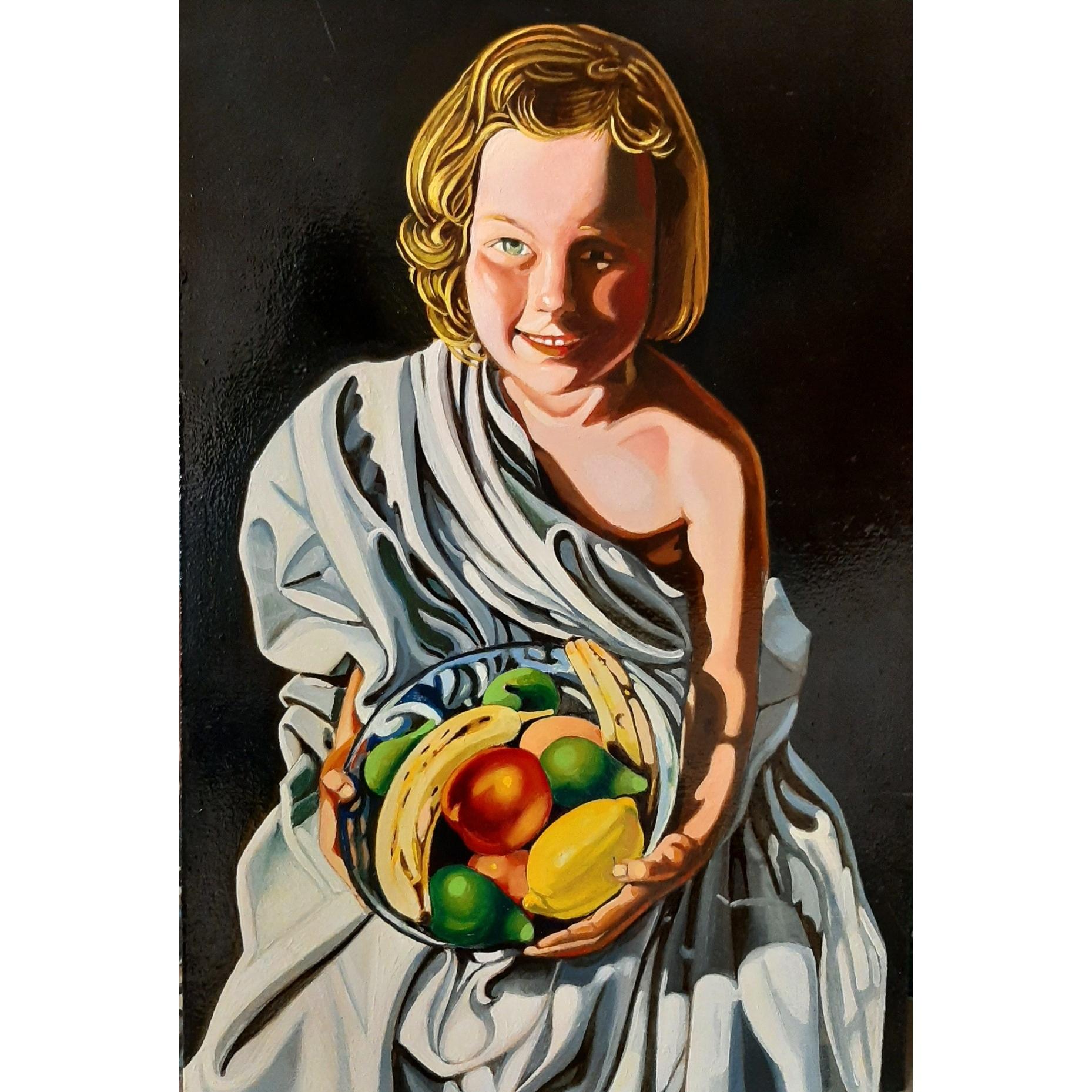 Ritratto di fanciulla, Olivia, con drappeggio e cesto di frutta studio figurativo