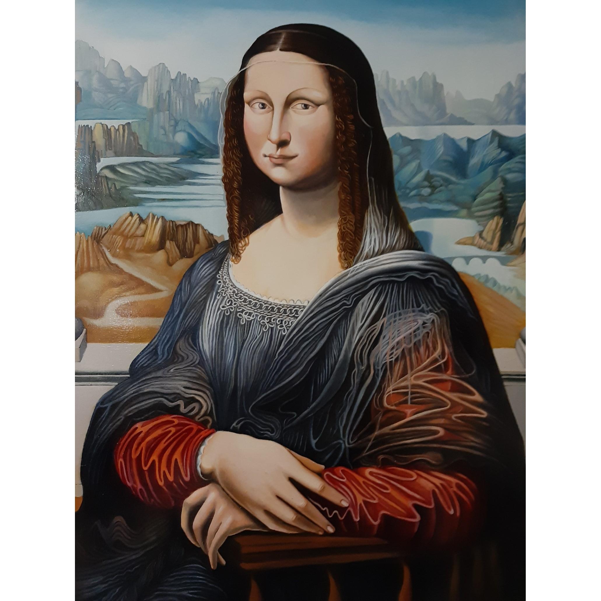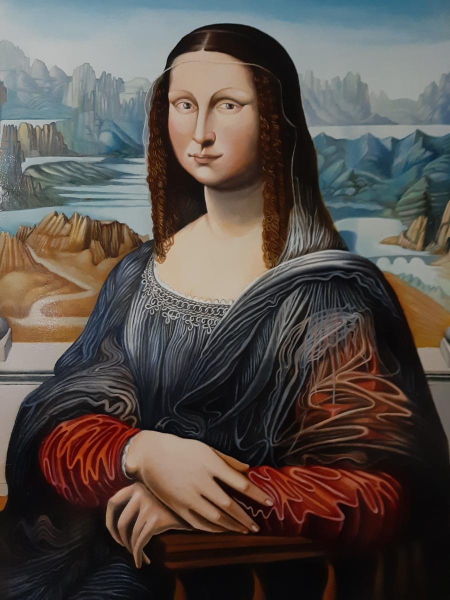 Libera interpretazione Copia da copia della Gioconda esposta al museo del Prado di Madrid contemporanea al quadro originale di Leonardo da Vinci, attribuita a F. Melzi o al Salai discepoli di Leonardo. Scoperta negli anni 50. Le dimensioni sono quelle del quadro originale.
