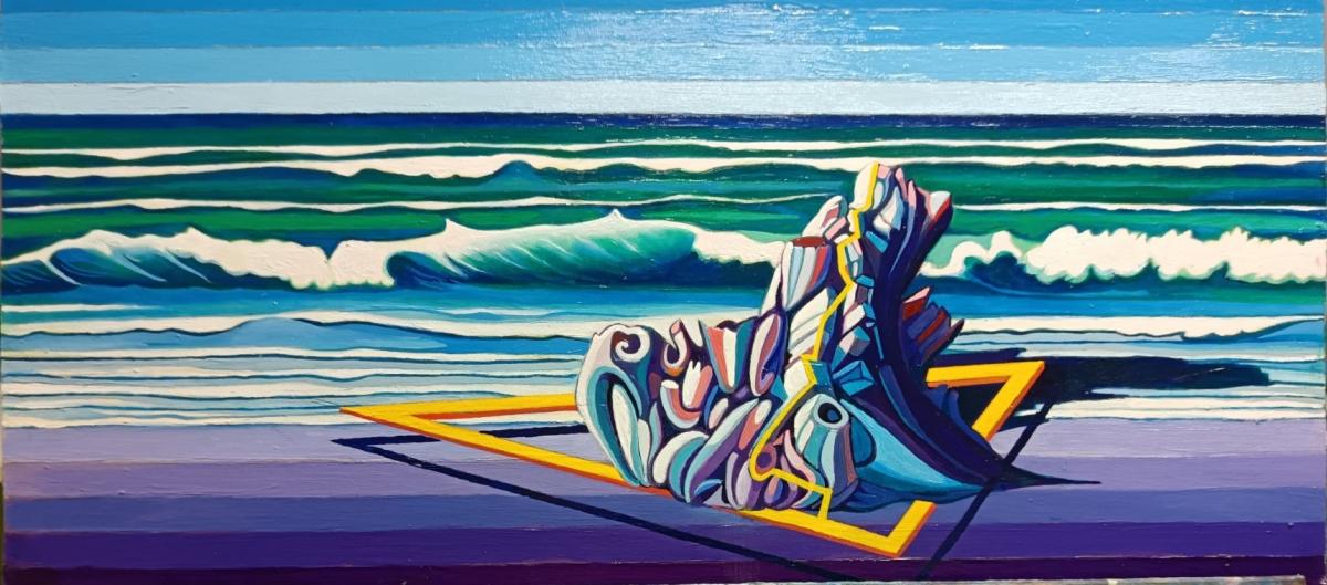 Radici di un tronco d'albero abbandonato sulla spiaggia dalla mareggiata riesumate da una geometria triangolare sospesa nello spazio e nel tempo