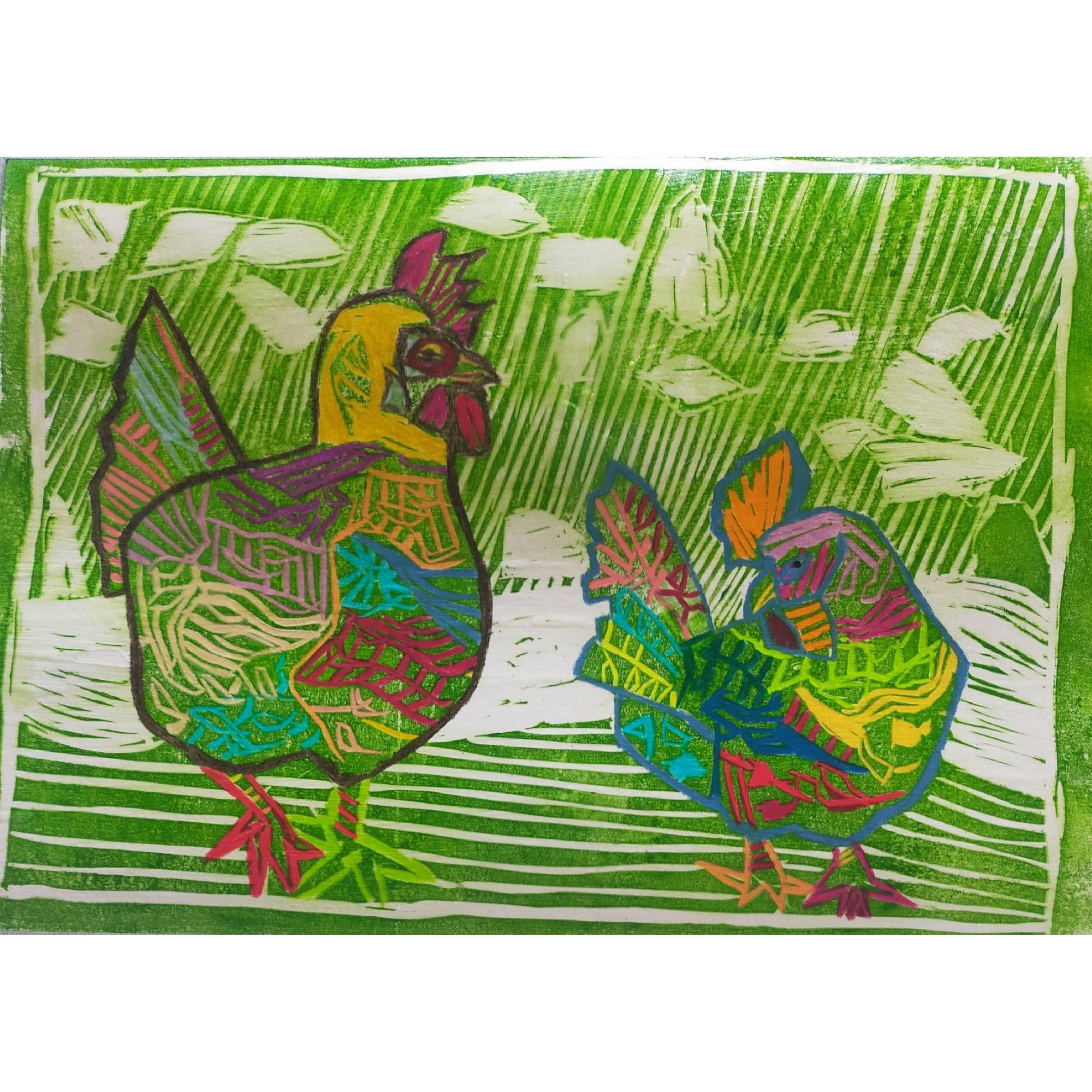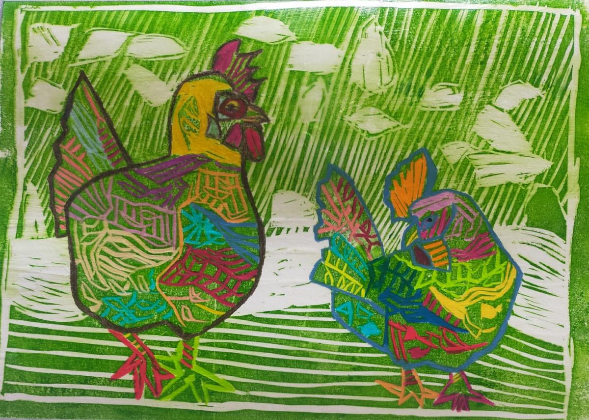 Incisione linoleum stampa e intervento pastelli, Cartoncino , 2025