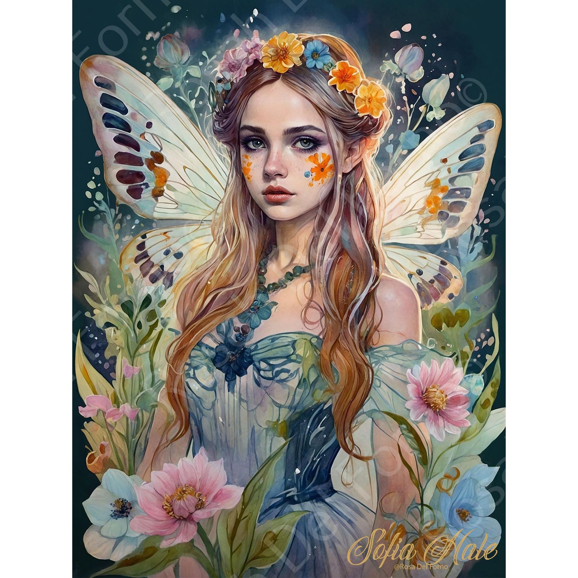 Descrizione:Questa splendida opera d'arte digitale raffigura una giovane fata immersa in un mondo incantato. La figura femminile, con i suoi lunghi capelli biondi adornati da fiori colorati, emana una presenza eterea e magica. Le sue ali delicate e variopinte aggiungono un tocco di meraviglia e leggerezza, mentre lo sfondo, ricco di dettagli floreali, crea un'atmosfera sognante e mistica. I suoi occhi penetranti e sereni catturano l'osservatore, trasportandolo in un regno fiabesco ricco di bellezza e incanto. I dettagli intricati e la combinazione di colori vibranti e tenui rendono questa opera un capolavoro visivamente affascinante.