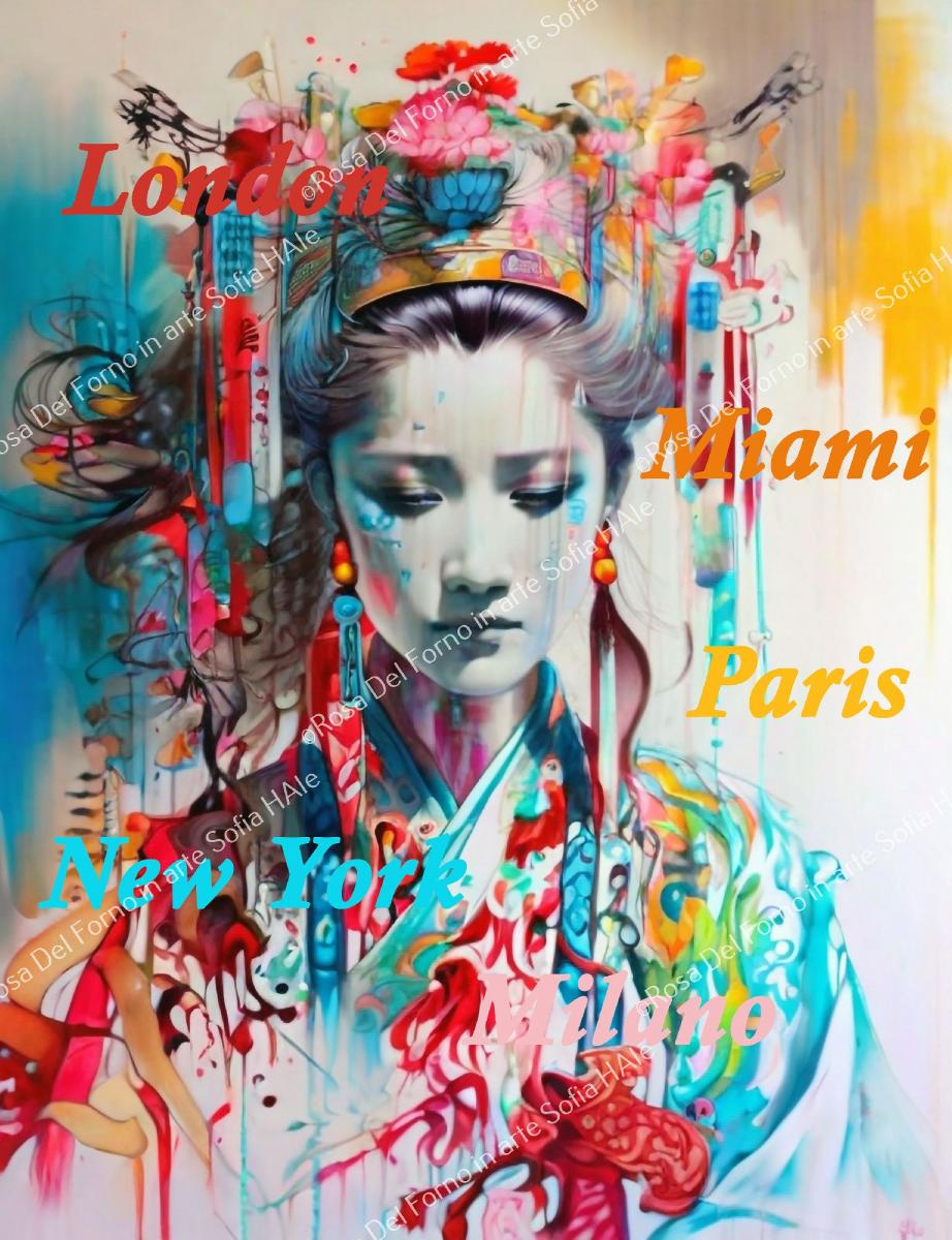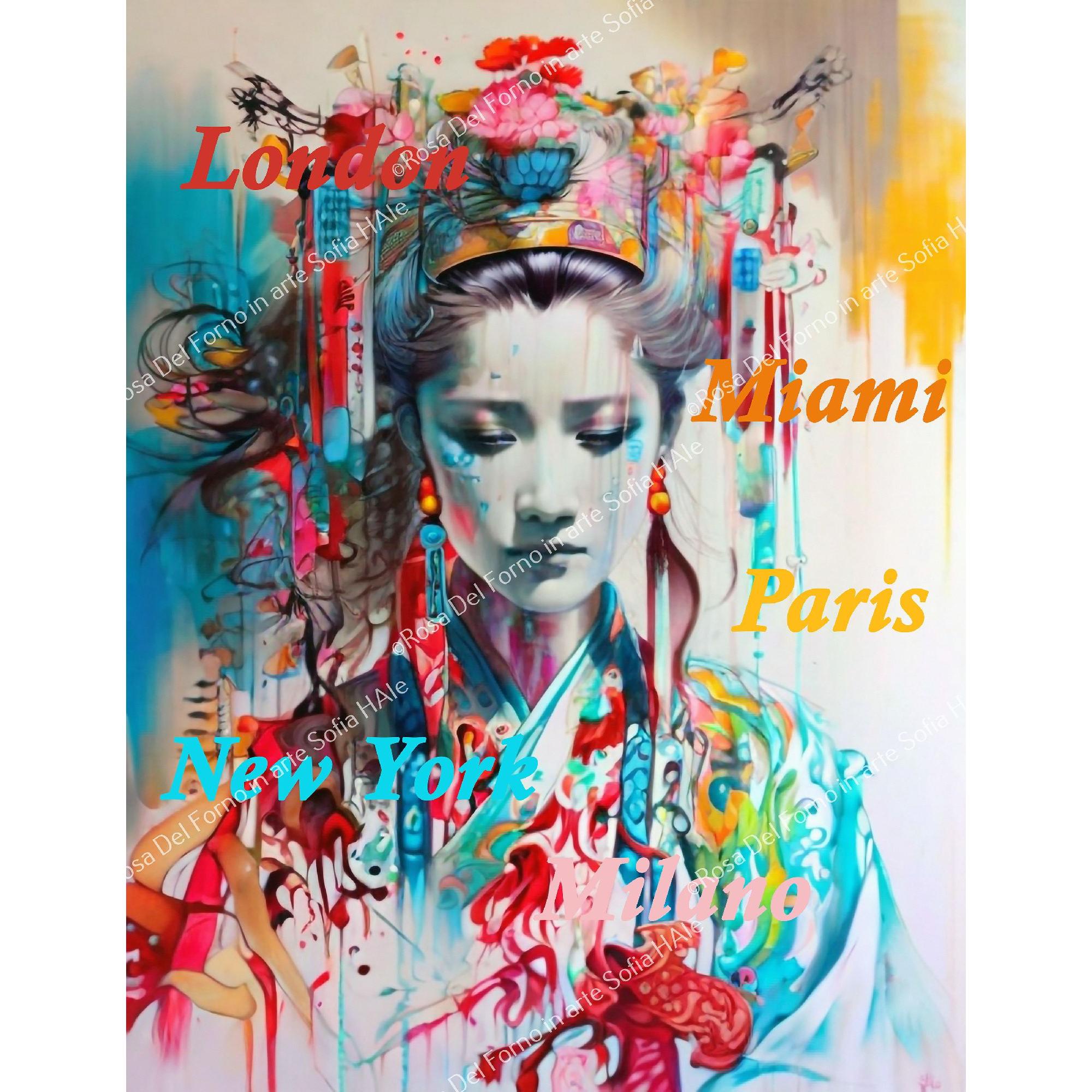 La tavolozza si anima con toni vivaci di turchese, porpora e corallo, con pennellate fluide che sembrano dissolversi ai margini della tela. Sullo sfondo appaiono i nomi sovrapposti di cinque grandi città – Londra, Parigi, New York, Miami, Milano – evocando un dialogo tra Oriente e Occidente, un viaggio ideale tra culture e stili.