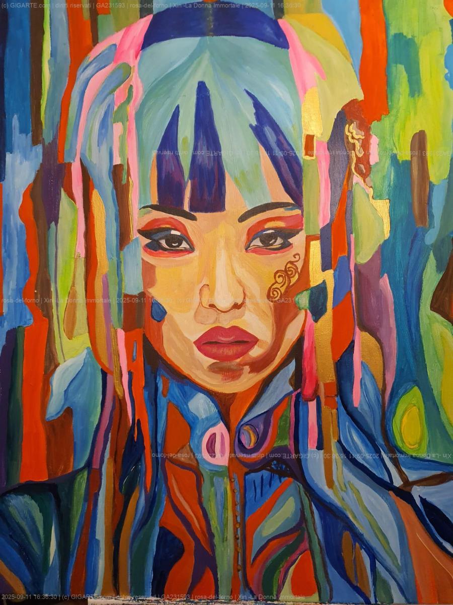 Quest'opera si inscrive nel solco di una ricerca pittorica che unisce stratificazione cromatica ed evocazioni simboliche, fondendo elementi di memoria arcaica con suggestioni post-umane. Xin – La Donna Immortale non è soltanto un ritratto: è un dispositivo visivo che interroga l'identità femminile nella sua duplice dimensione, sacra e artificiale. Le pennellate frammentate e la tavolozza squillante rimandano all'espressionismo cromatico e alla transavanguardia italiana, ma la struttura del volto e l'inserzione di oro liquido introducono un registro iconico che richiama la tradizione orientale. Xin si configura così come una "figura liminale": al contempo divinità immortale e automa, eco delle sperimentazioni tecnologiche che in Asia ridefiniscono l'idea stessa di corpo e di coscienza. L'opera diventa quindi un manifesto visivo della condizione contemporanea: un ibrido fra carne e metallo, spiritualità e ingegneria, mito e futuro.