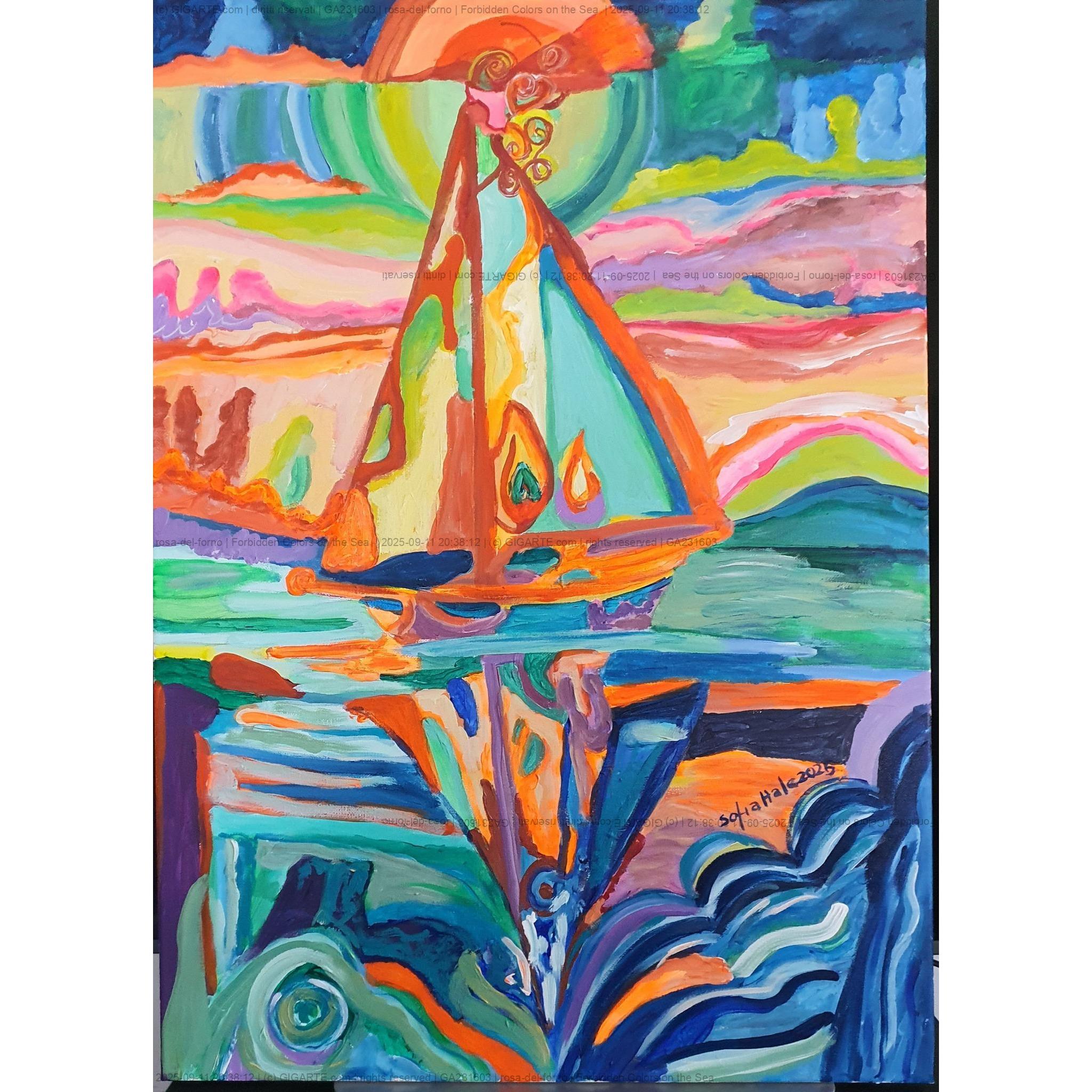 Si certifica che l'artista Rosa Del Forno In Arte Sofia Hale giovedì 11 settembre 2025 ha archiviato la foto dell'opera GA231603 dal titolo "Forbidden Colors on the Sea "