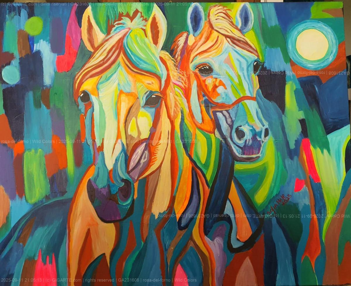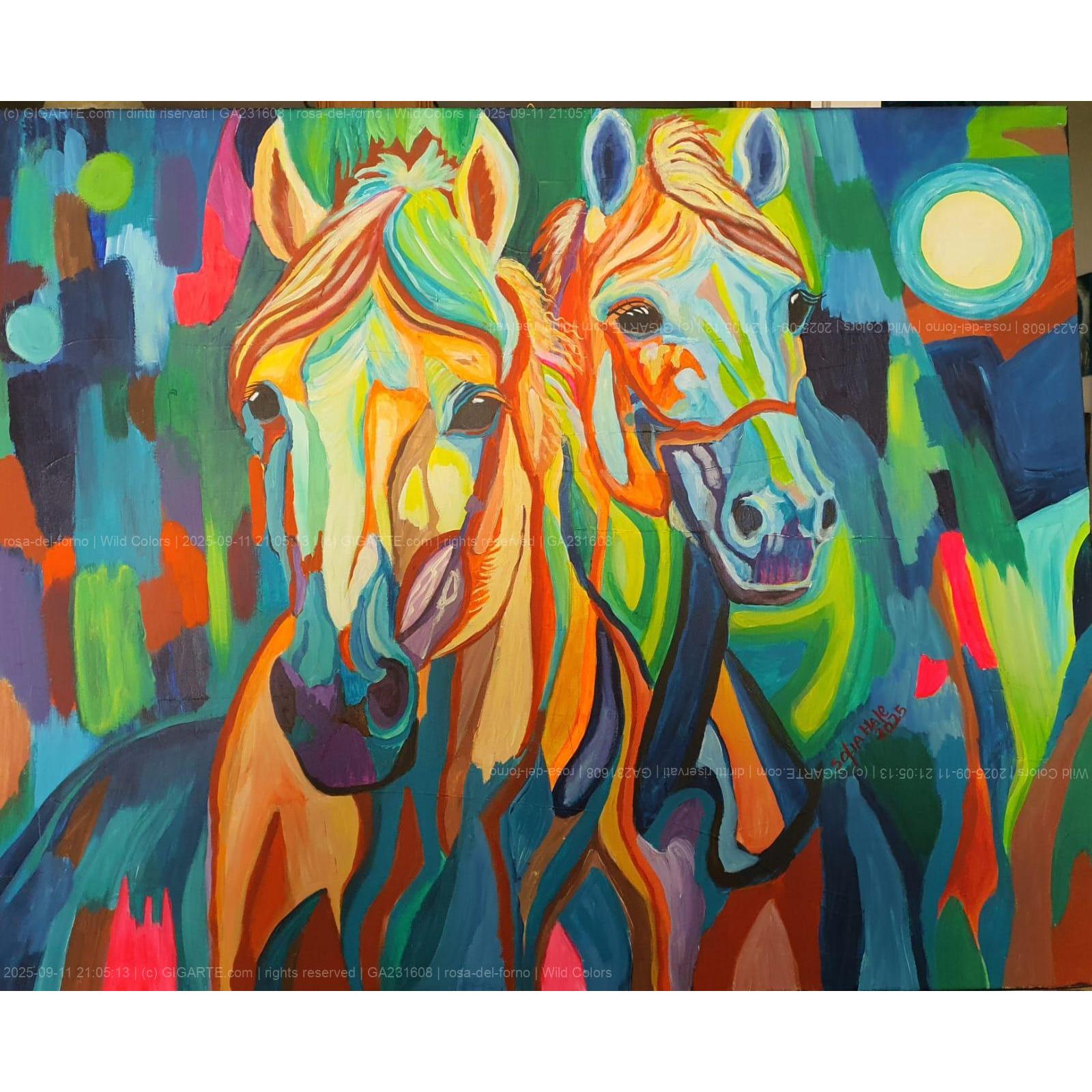 In Wild Colors la potenza della natura prende forma attraverso lo sguardo di due cavalli, creature da sempre simbolo di libertà, forza e istinto primordiale. Non è un semplice ritratto animale: le figure emergono da un vortice cromatico che dissolve i confini del reale e proietta lo spettatore in una dimensione visionaria.