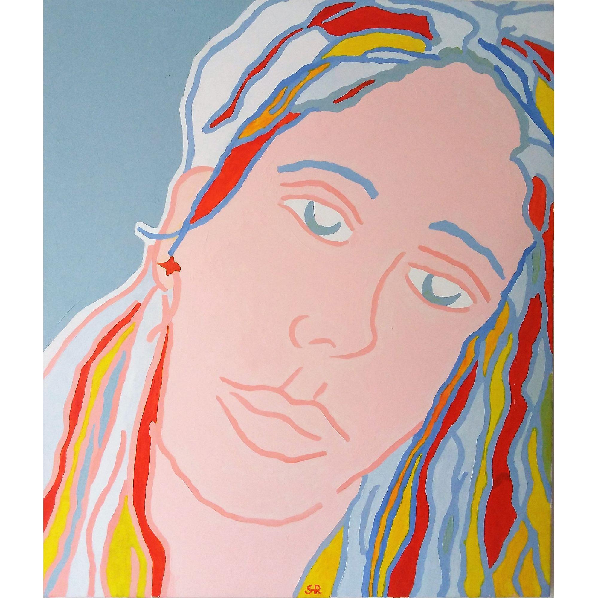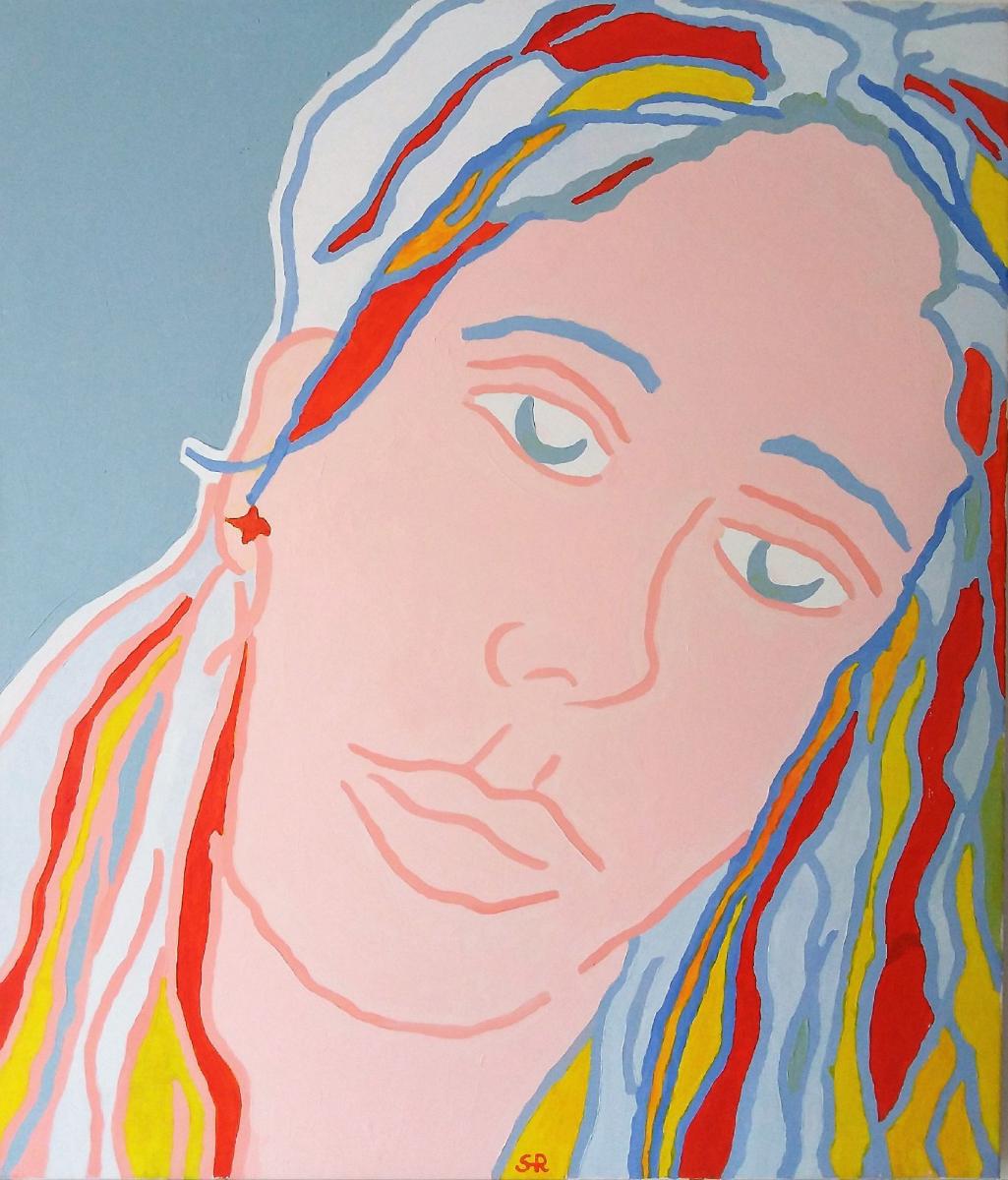 Un ritratto malinconico guarda l'osservatore alla ricerca di risposte a interrogativi che si celano al di sotto di una pittura stesa a campiture piatte. la pittura acrilica si colora di tinte pastello che rendono l'opera ancora più vicina a una dimensione domestica.