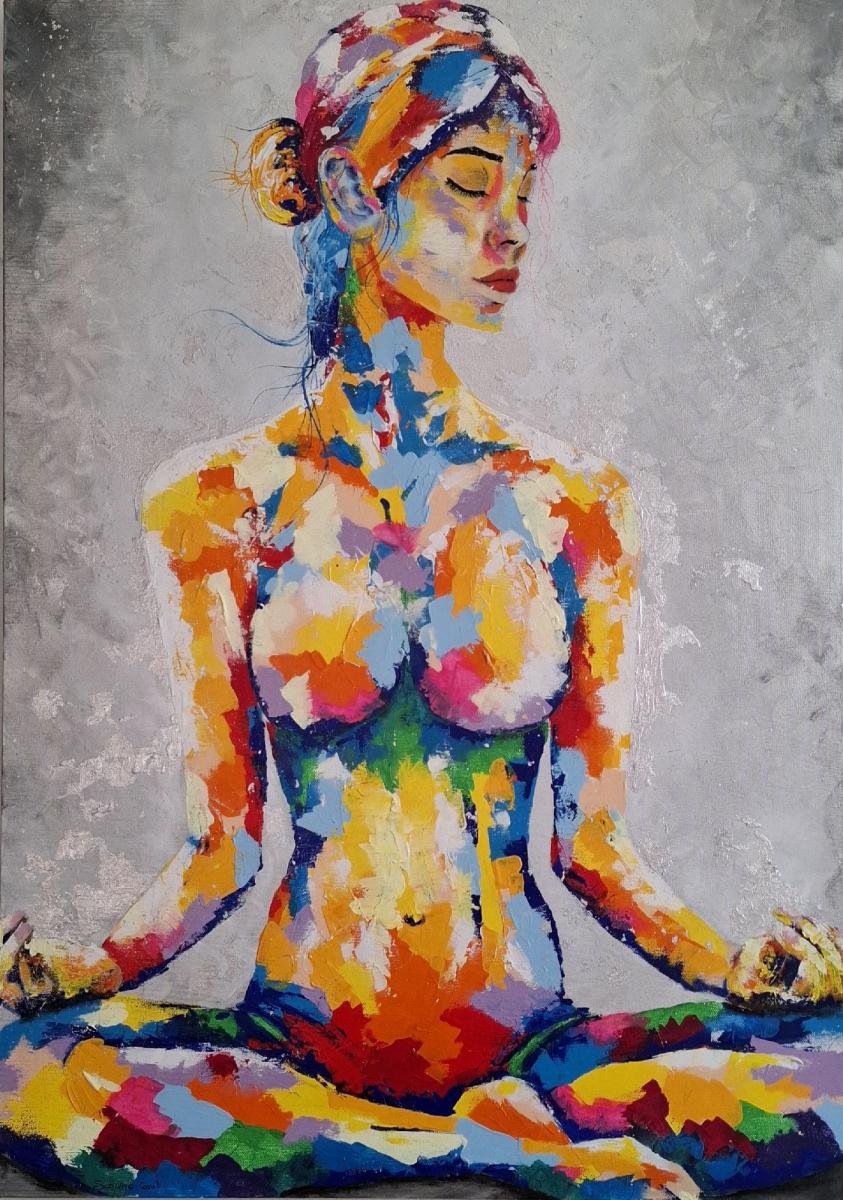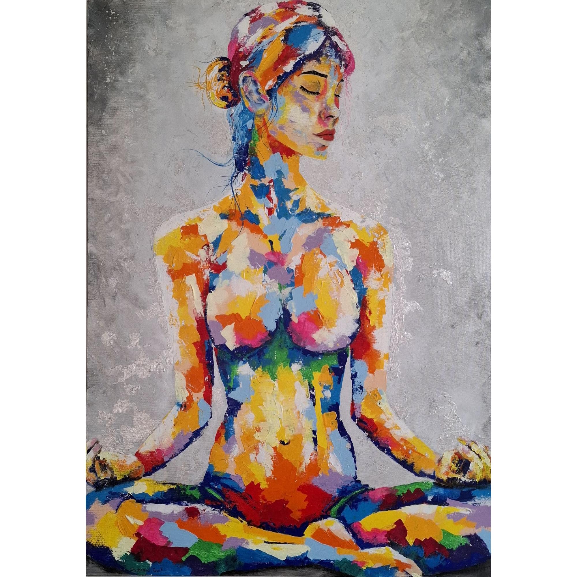 NUDA ENERGIASpogliata di tutto, resta luce. Qui rinasco.Ho creato questo quadro come un atto di liberazione e consacrazione: ogni colore è energia, ogni centro un varco.Questo è il mio nuovo inizio, il corpo come tempio, la luce come guida.