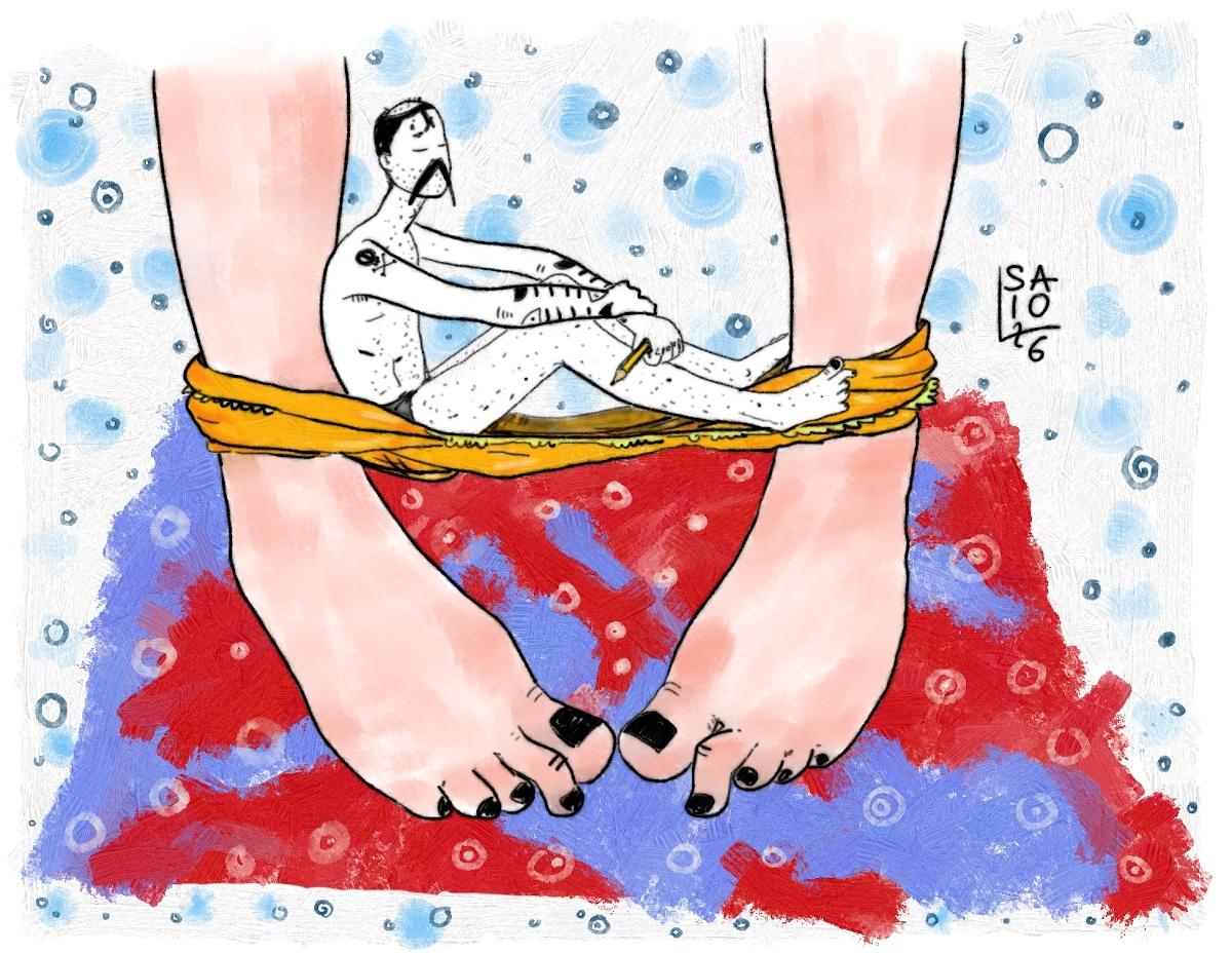 assorto, seduto sulle mutande gialle tese da una enorme caviglia all'altra, sta Saio G in mutande e con una matita in mano. Sotto gli enormi piedi nudi un tappetino mediterraneo di mare e terre rosse. L'aria è piena di cerchietti e bolle blu e bianche. Sarà pace quella di colui che siede tranquillo sull'amaca tenuta ai pali dell'amore pur se attorno la terra è tinta di rosso?