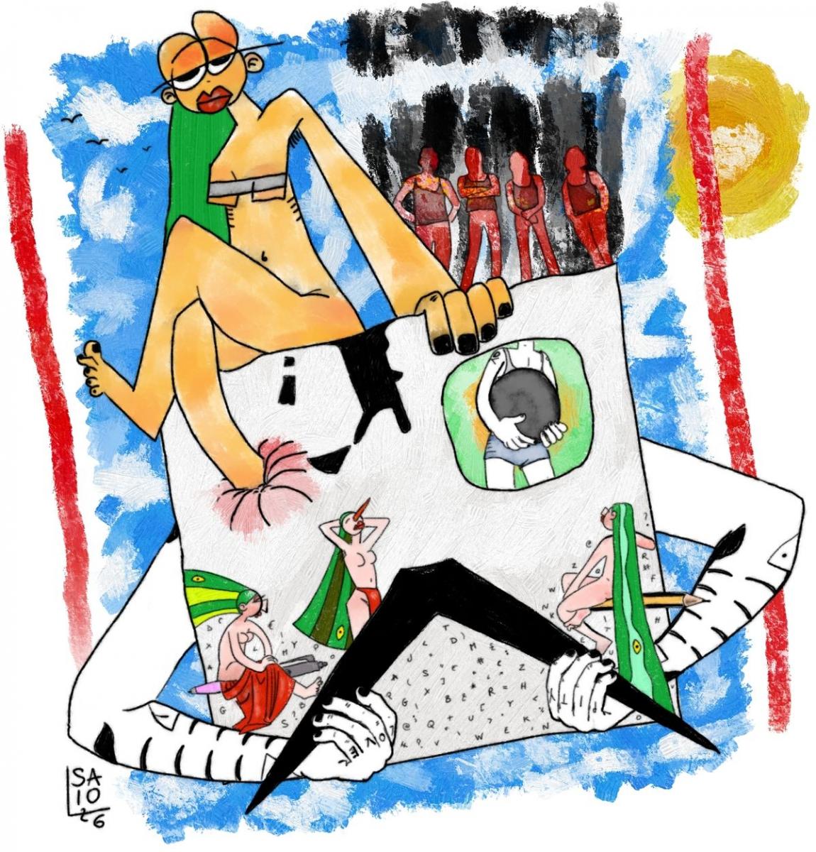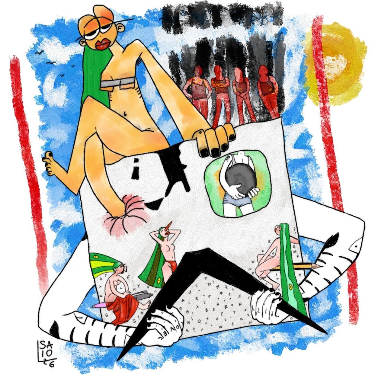 su sfondo azzurro macchiato di bianco. un faccione quadrato di Saio G da cui, al posto delle orecchie, spuntano le braccia che afferrano i baffi neri come ad allacciare un reggiseno. in un occhio quadrato, un ragazzino regge la pupilla nera. l'altro occhio è accecato dal piede di una figura femminile seduta, indolente, sulla testona quadrata; accanto a questa figura, nuda e con capelli verdi, quattro figure ricordati il gruppo The Doors stanno rosse su sfondo di fumi neri. tre figure femminili con capelli verdi sono nel viso quadrato, una seduta su una penna, con veste rossa sulle gambe, un'altra in piedi con naso rosso puntato in alto e l'ultima seduta nuda di spalle su una matita. i peli nascenti di barba sul viso quadrato sono lettere dell'alfabeto. a destra e a sinistra due rette rosse e in alto a destra un disco vagamente solare.