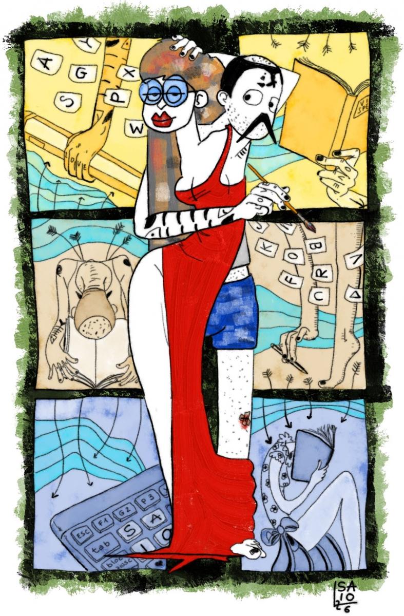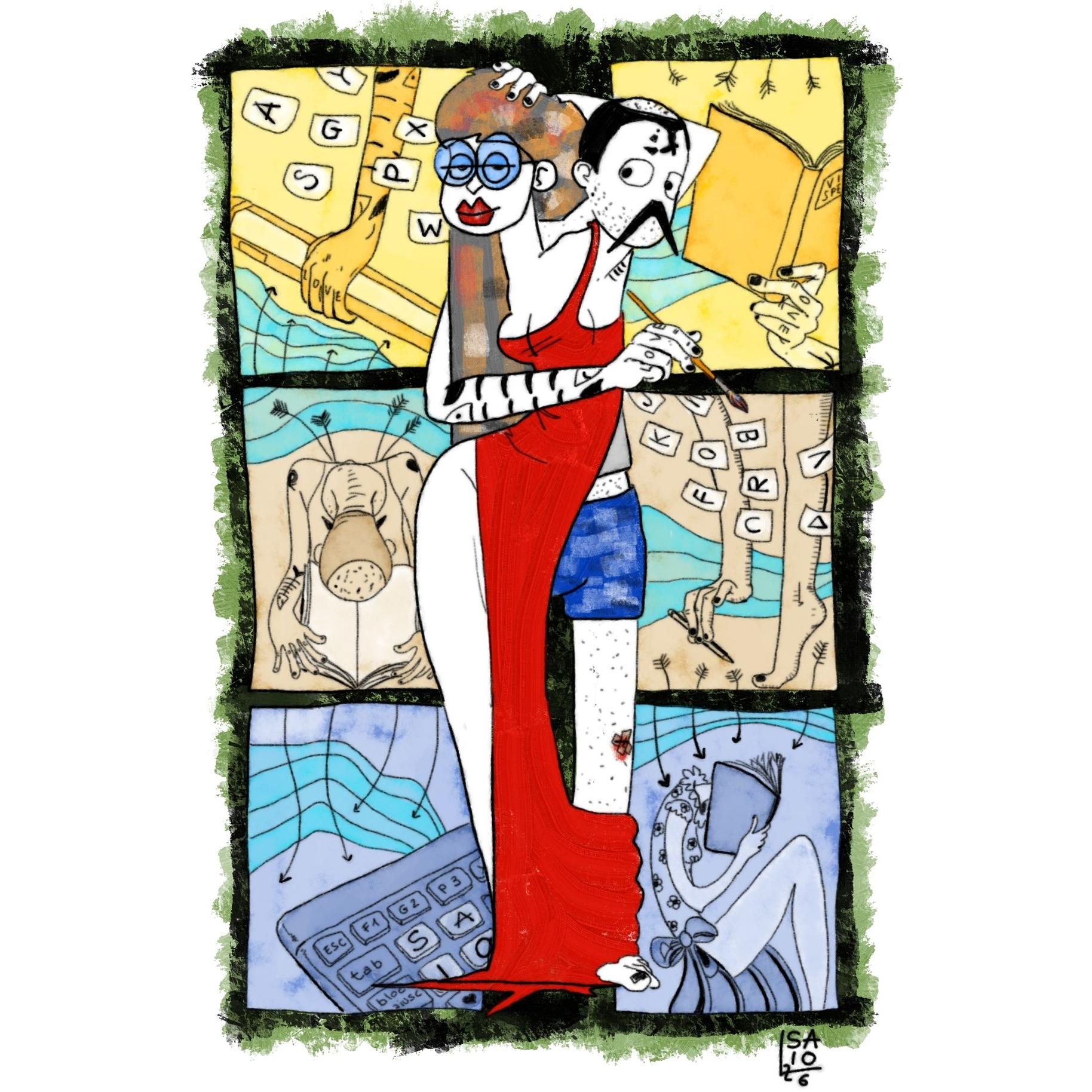 mezzo Saio G e mezza figura femminile si intrecciano a formare una figura intera. Saio G in mutande e canottiera regge un pennello; la figura femminile in abito da sera rosso ha una mano tra i capelli lunghi e grigi e arancio e bianchi e neri. Sullo sfondo sei riquadri. Nei tre a sinistra, dall'alto in basso: un braccio di Saio G che prende una matita gigante e foglietti con lettere dell'alfabeto; Saio G con frecce alla schiena legge chino su un enorme libro con pagine bianche; una tastiera in cui si legge SAIO. Nei tre a destra, dall'alto in basso: mano femminile che regge un libro; braccio femminile che raccoglie una matita accanto a caviglia femminile in punta di piedi; figura femminile seduta con abito a fiori e gambe nude con testa immersa in un libro. Matrixmonio.