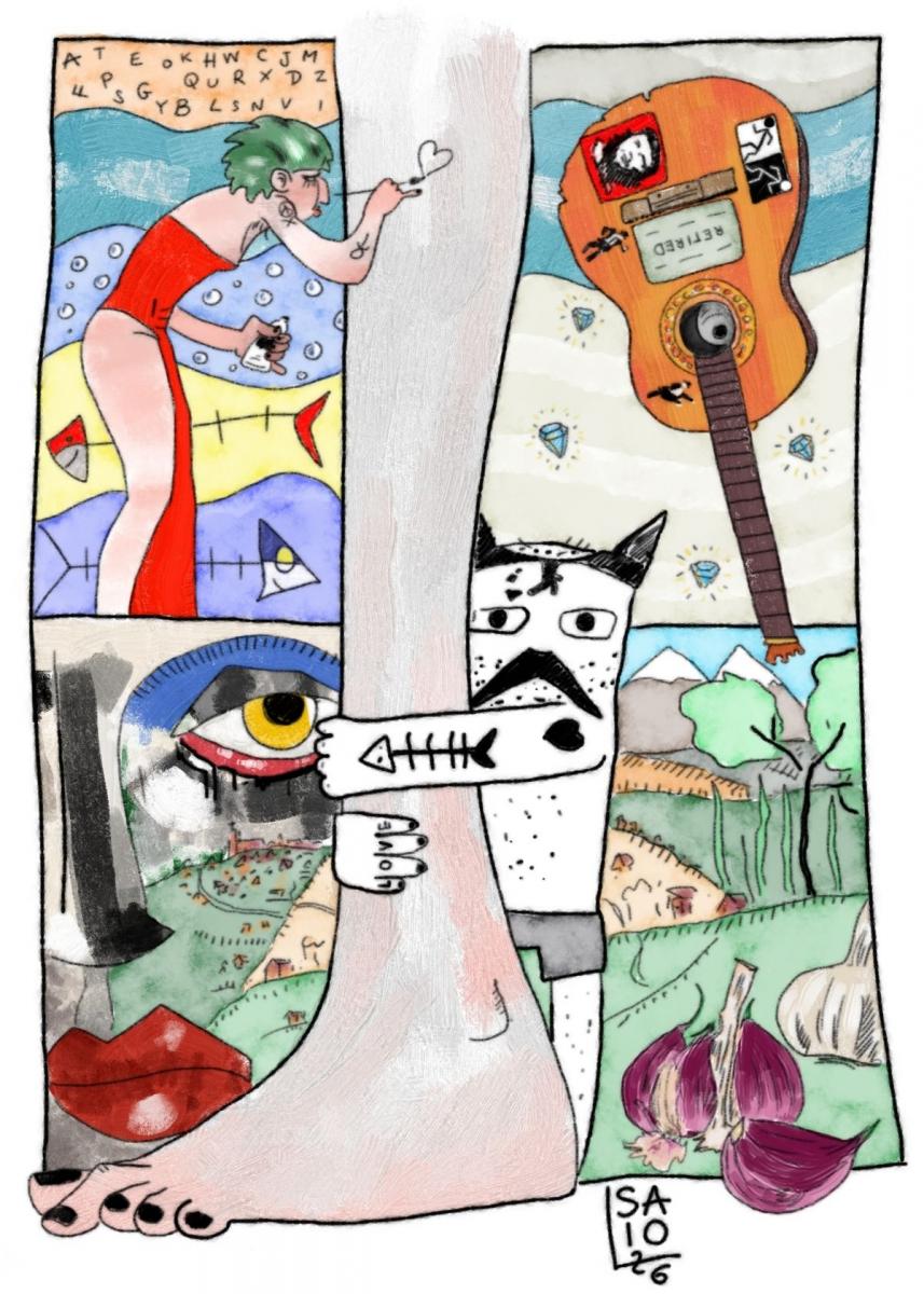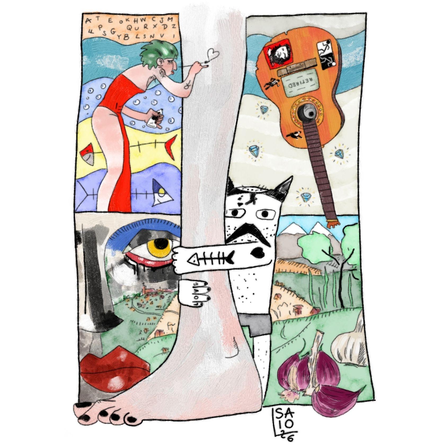 Abbracciato ad una caviglia Saio G gatto in mutande. Sullo sfondo, quattro porzioni. In alto a sinistra una figura femminile in abito da sera rosso dipinge un cuore sulla caviglia di cui sopra, nello sfondo fasce di colore con bollicine, lettere dell'alfabeto, lische di pesce sorridenti. In alto a destra una chitarra rotta e senza corde con adesivi, sullo sfondo una barra azzurra taglia un cielo sabbia con diamanti. In basso a destra un paesaggio marchigiano con agli rossi in primo piano, il paesaggio travasa nella porzione in basso a sinistra dove si fonde con un viso femminile con occhio solare ed espressione direi intima.