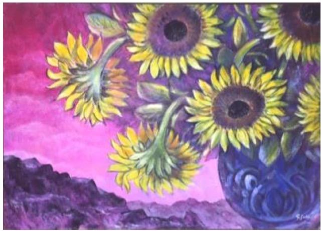 Questo quadro è stato disegnato dalla mia finestra nello studio . I girasoli in Mexico sono molto più piccoli e un contadino, non lontano dalla mia casa mi ha regalato un po di questi bellissimi fiori . Approfittando della luce ho voluto creare un paesaggio in lontananza color purpur e dare risalto hai girasoli.