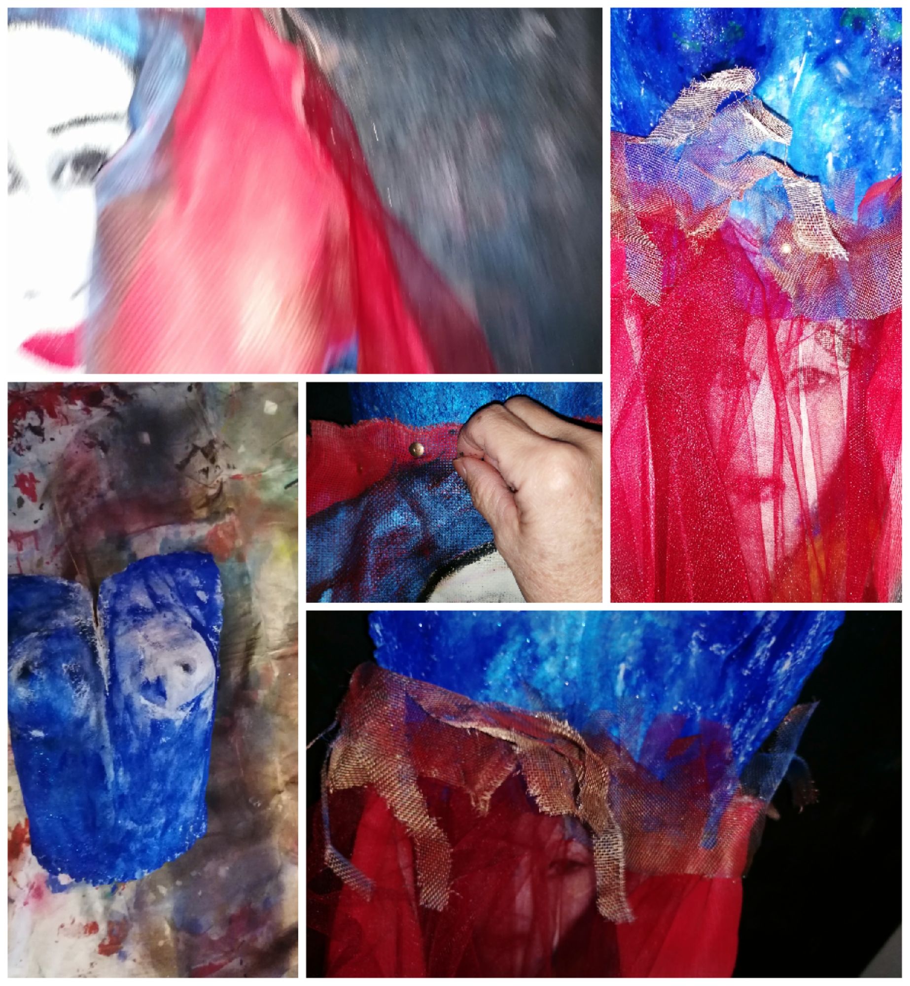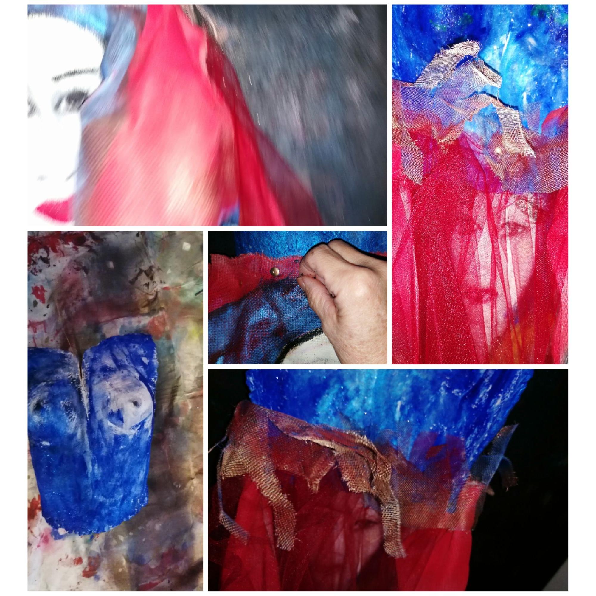 pigmenti multicolor, busto in cartapesta, vestito lino grezzo., 2022