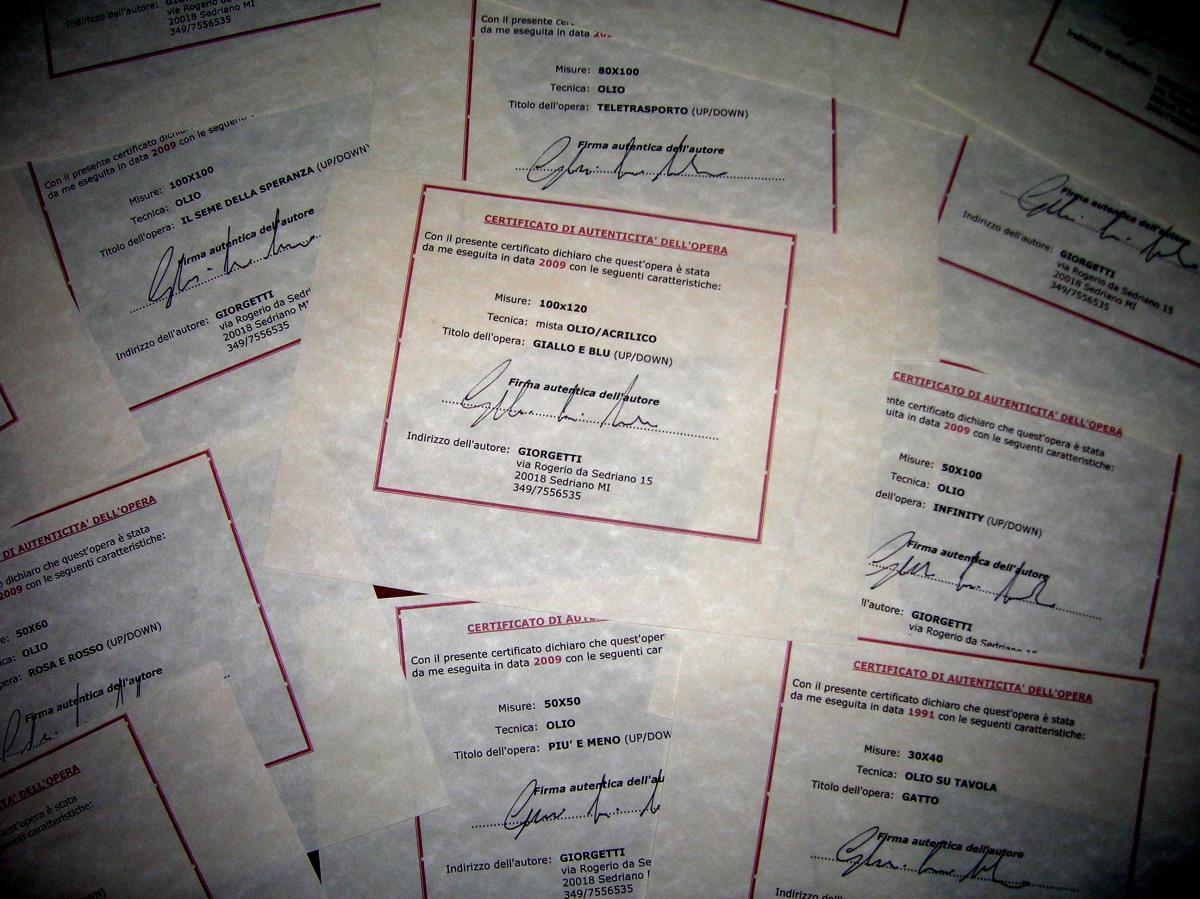 Tutti i certificati di autenticità delle opere presenti sul sito, saranno consegnati insieme all'opera acquistata e garantiscono anche l'unicità delle stesse che non saranno mai nè riprodotte nè imitate da me medesimo. GIORGETTI